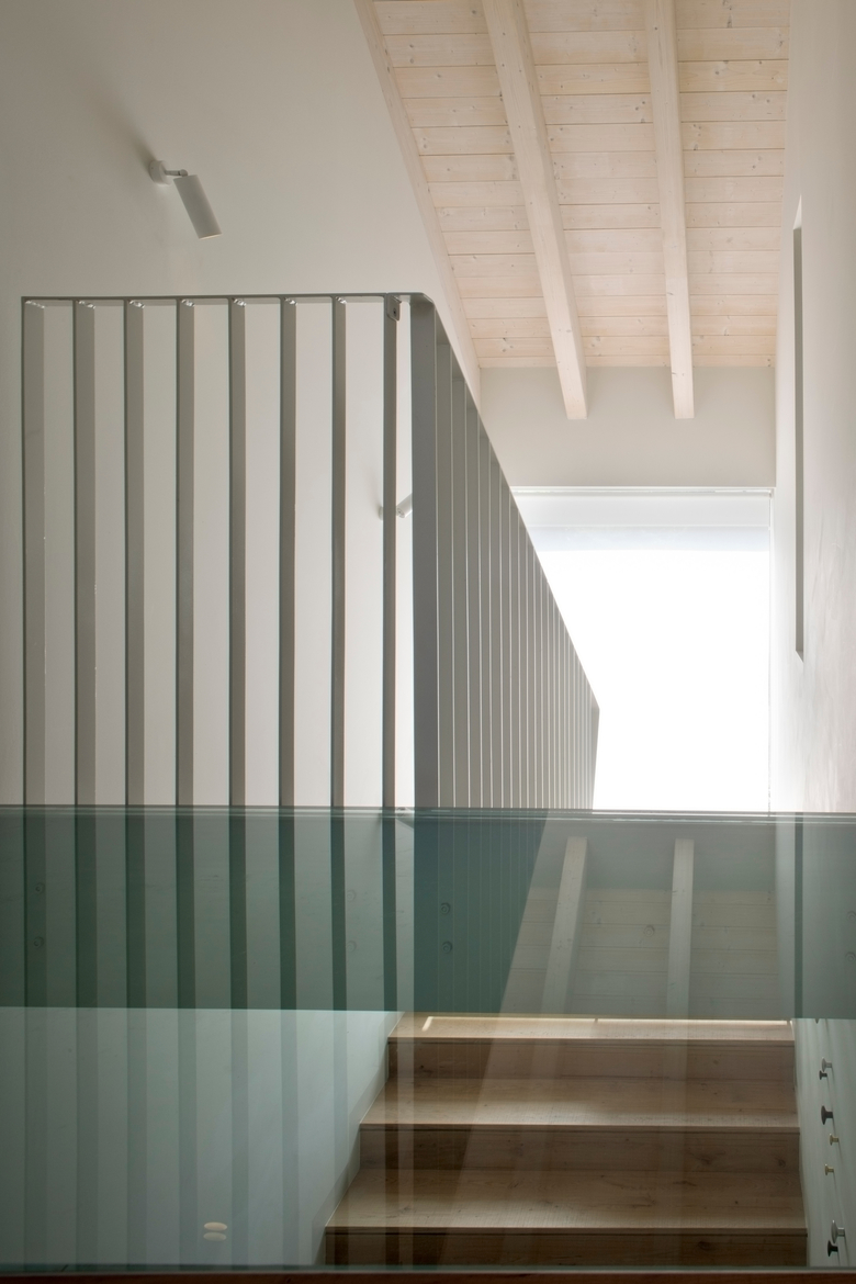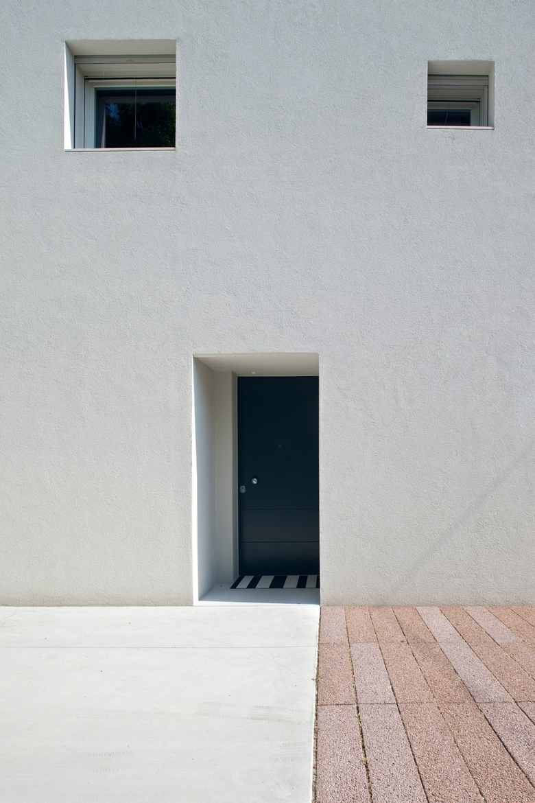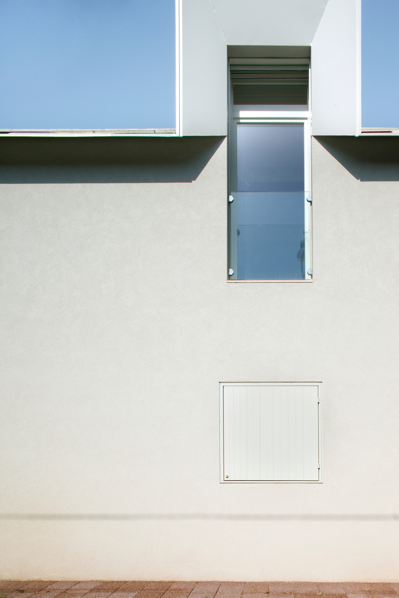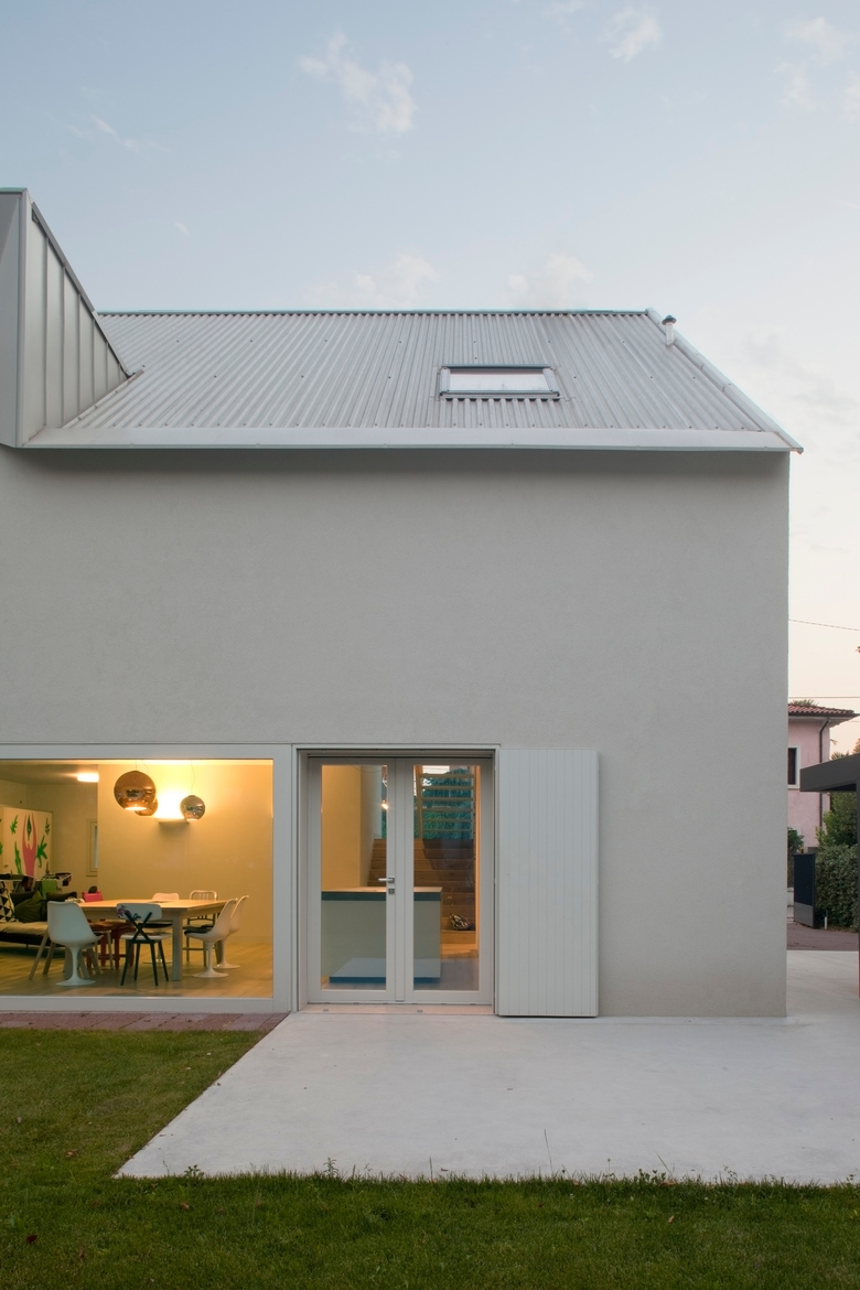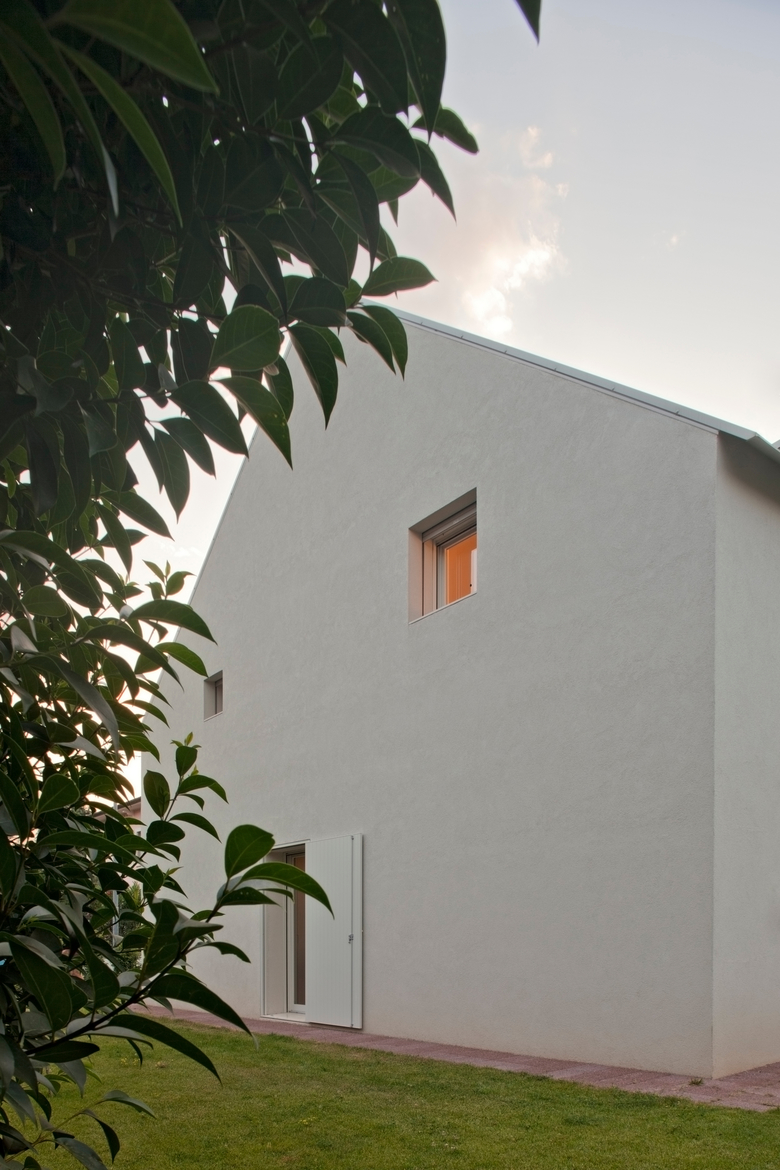 A house as a child would design it: the slope of the roof allows a strong verticalisation of the rooms, whose space physically penetrates the inclination of the roof through large openings to the outside. The dominant white color works as a three-dimensional sheet of paper, where you can play with the alternation between small and large, between outside and inside, between the sky and the large garden in the back where the ground floor opens.