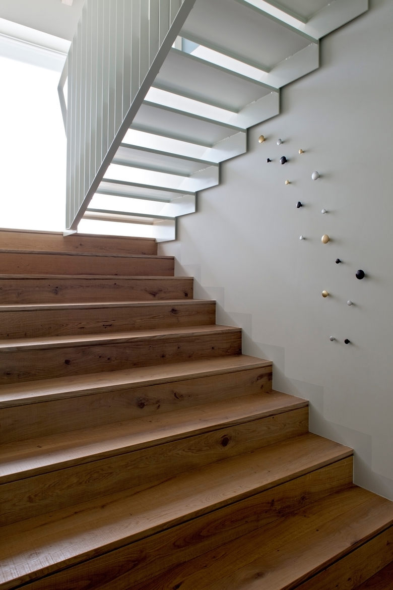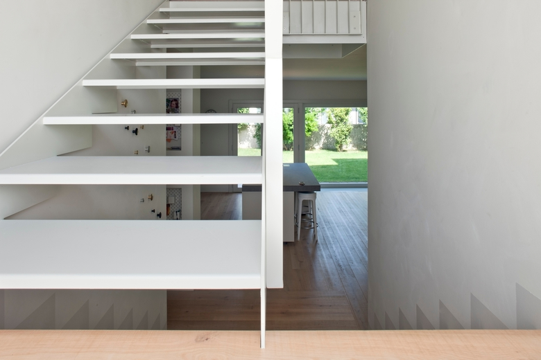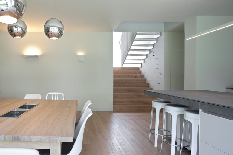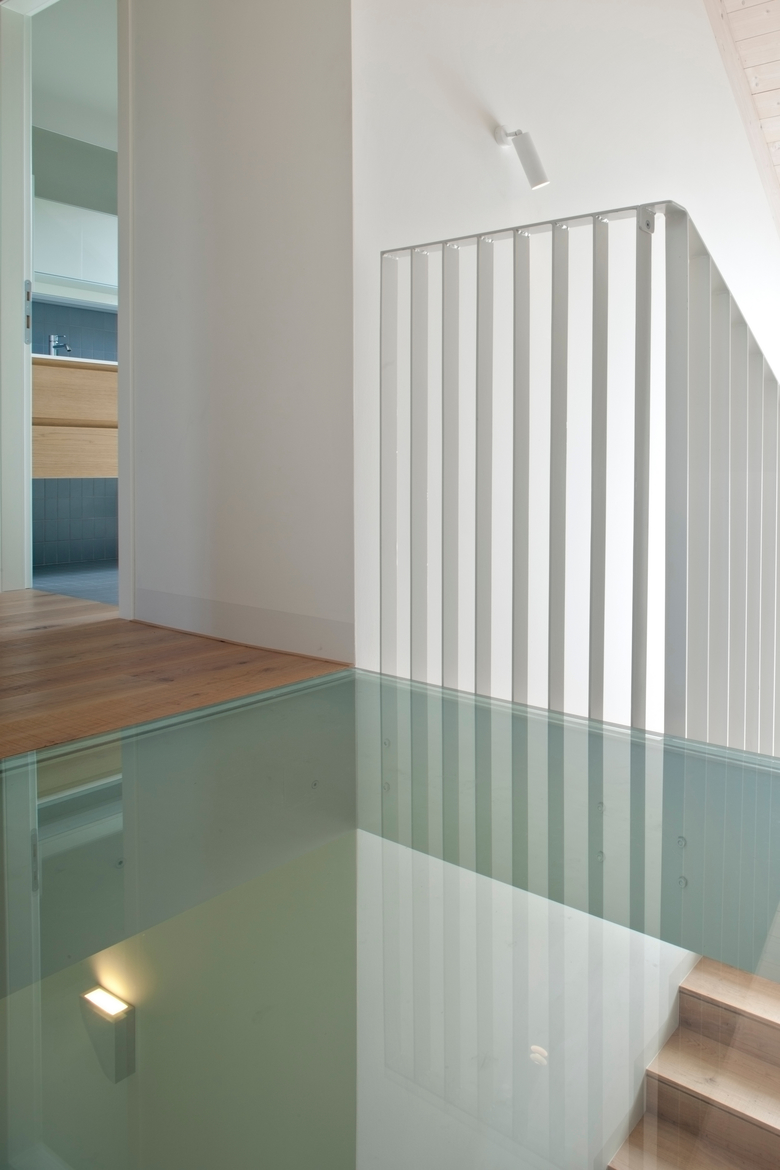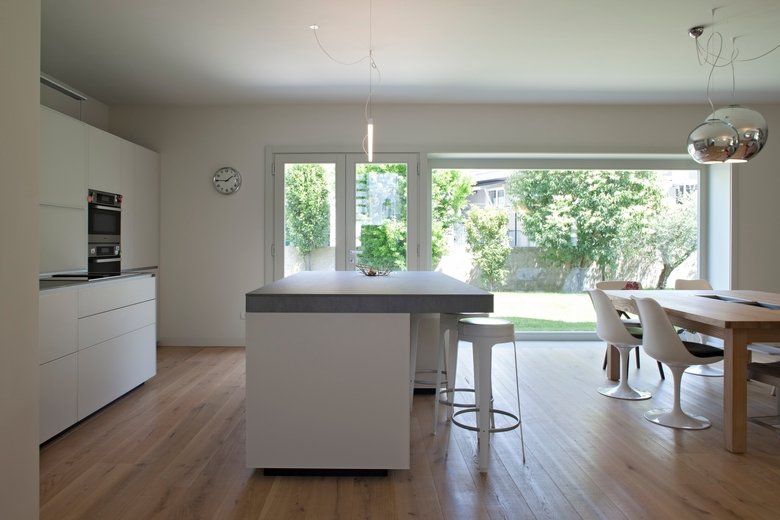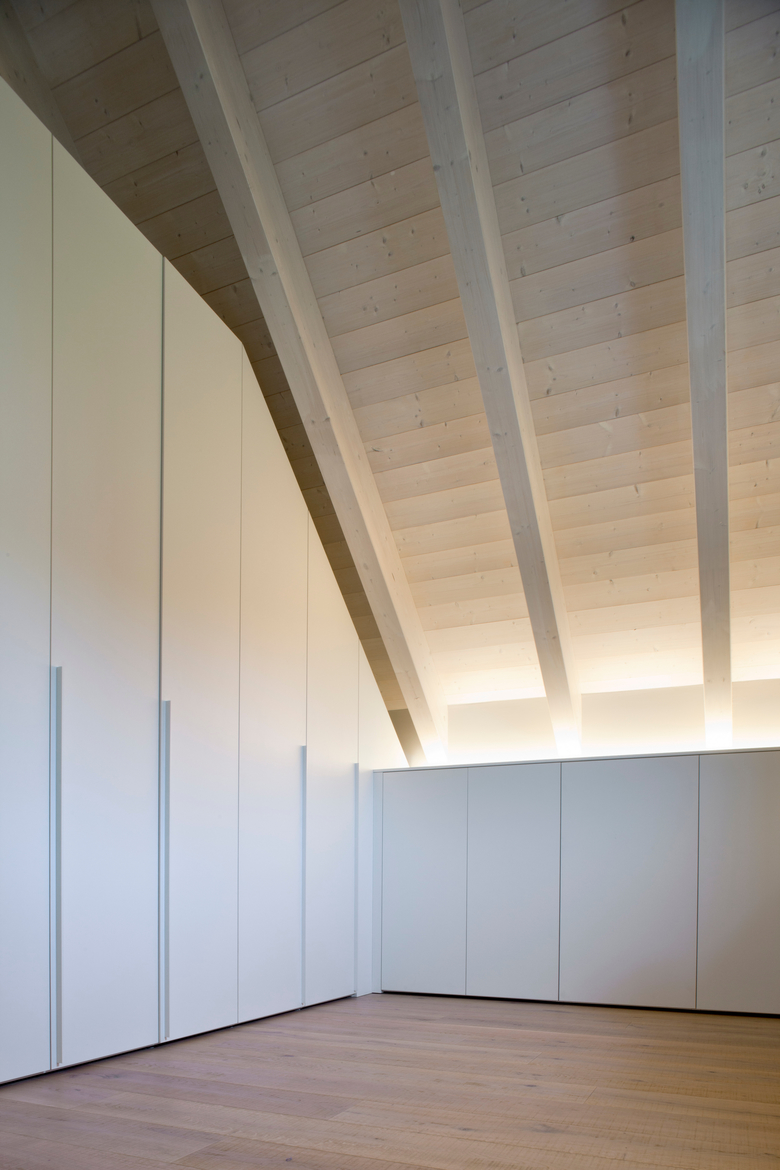 A house as a child would design it: the slope of the roof allows a strong verticalisation of the rooms, whose space physically penetrates the inclination of the roof through large openings to the outside. The dominant white color works as a three-dimensional sheet of paper, where you can play with the alternation between small and large, between outside and inside, between the sky and the large garden in the back where the ground floor opens.