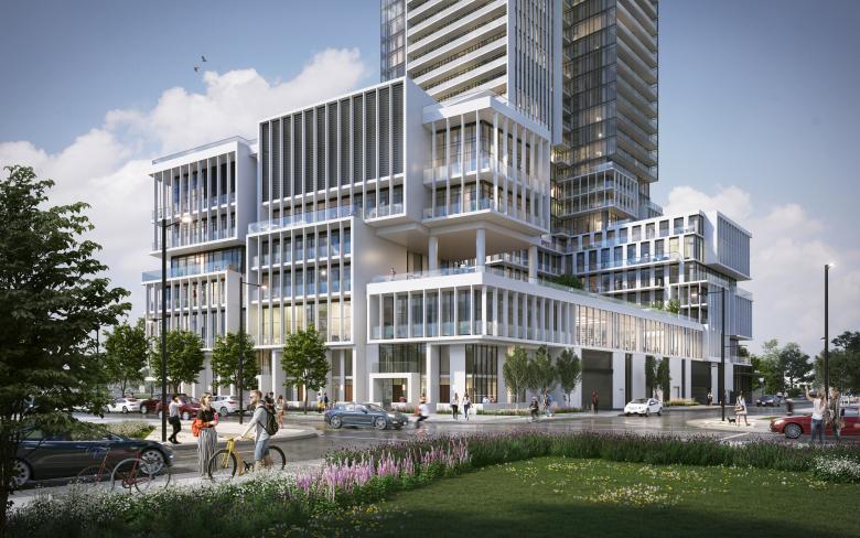 Three sides of the podium have residential units, some with wrapping balconies. At grade on the west side, the lobby and amenity space provide street-related presence. On the east side of the site is a private Mews street shared between M3 and M4. The podium steps down to three storeys along the private right-of-way to allow sunlight to pass through and provide some visual relief along its length.