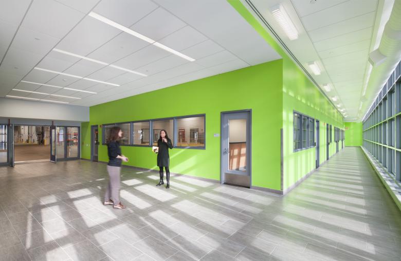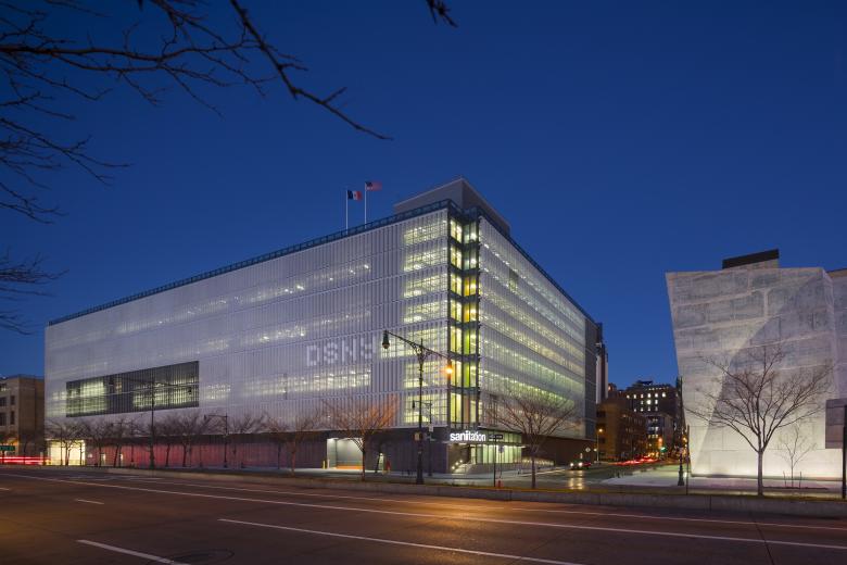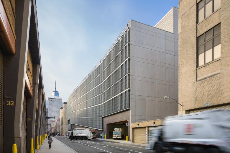 The Manhattan Districts 1/2/5 Garage, overlooking the Hudson River at the corner of Spring Street and West Street, houses three district garages for the NYC Department of Sanitation. The new multi-story building accommodates over 150 sanitation vehicles including trucks, front-end loaders, salt spreaders, heavy-equipment wreckers, and personnel vehicles; separate vehicle wash and personnel facilities for each district; and centralized fueling and repair facilities. The double-skin façade wraps the curtain wall with 2,600 custom, perforated, metal fins, vertically articulating and lighting the building’s massing.