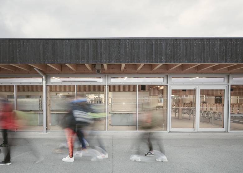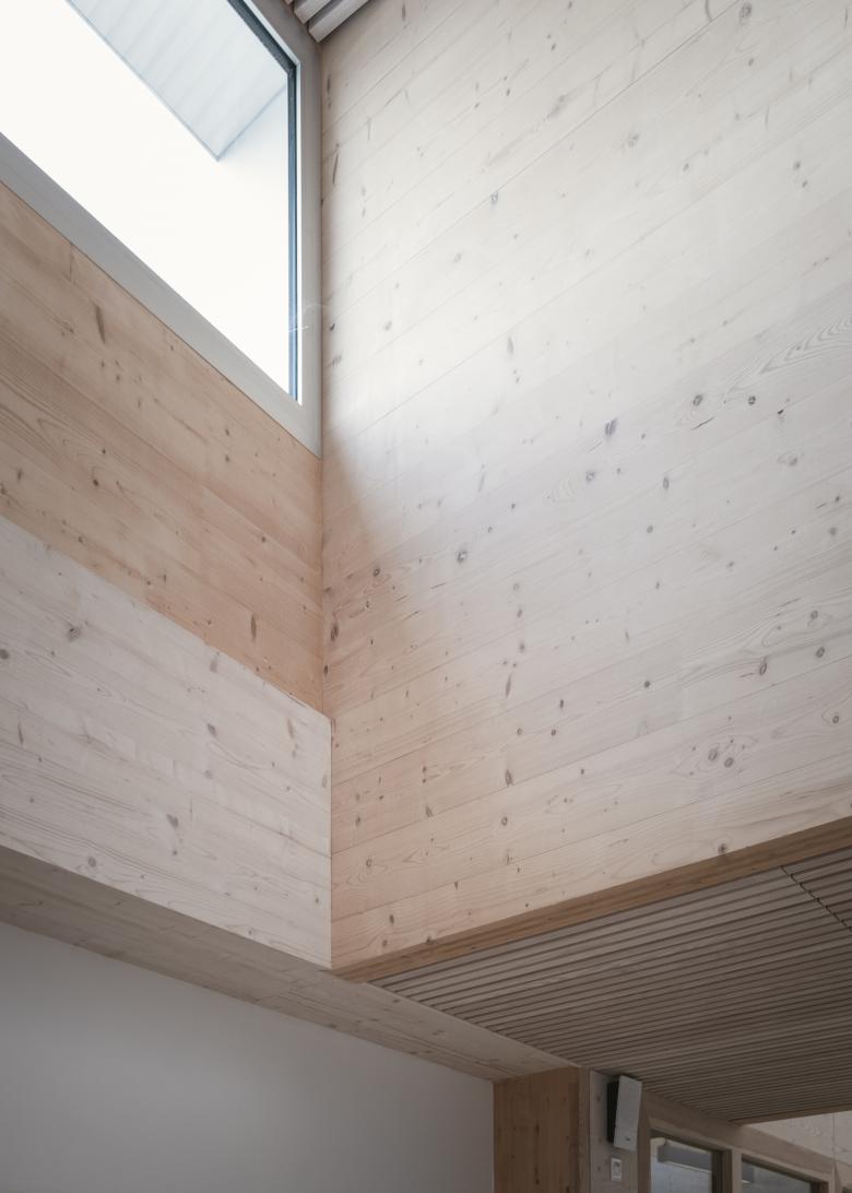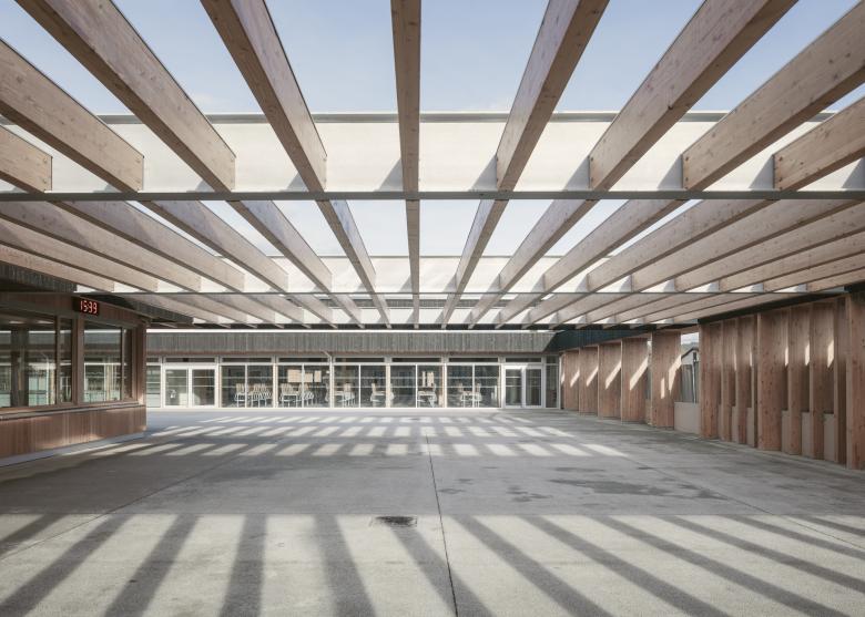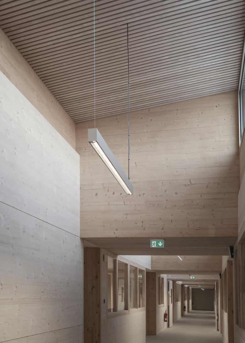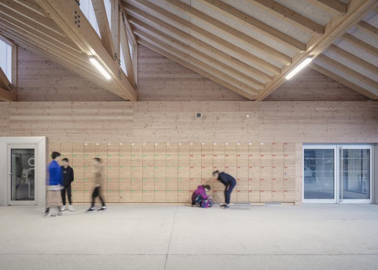 Ein umlaufendes, weit auskragendes Vordach aus dunklem, karbonisierten Holz schützt vor zu starker Sonneneinstrahlung. Dieses Material garantiert Langlebigkeit ohne jegliche Wartung. Die zurückhaltende, geschlossene Gestaltung steht im Kontrast zu den großzügigen, kommunikativen Innenräumen, in denen helles Holz dominiert. Einige Trennwände zwischen den Klassenzimmern wurden aus Lehmziegeln errichtet, um die Akustik und den hygrothermischen Komfort zu verbessern.