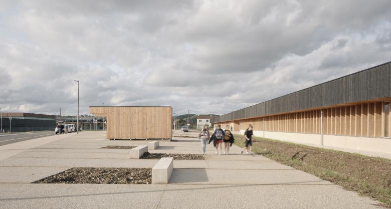 Das Collège am Ortsrand von Bretenoux ist von der Straße etwas abgerückt und definiert mit seiner breiten Westfront einen öffentlichen Platz. Die kompakte Organisation des ebenerdigen Gebäudes erinnert an die mittelalterlichen Landgüter der Region. Der horizontale Monolith ist harmonisch in seine ländliche Umgebung eingebettet und setzt einen urbanen Akzent am Eingang des Ortes.