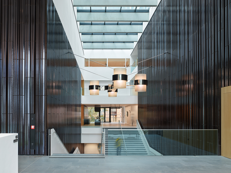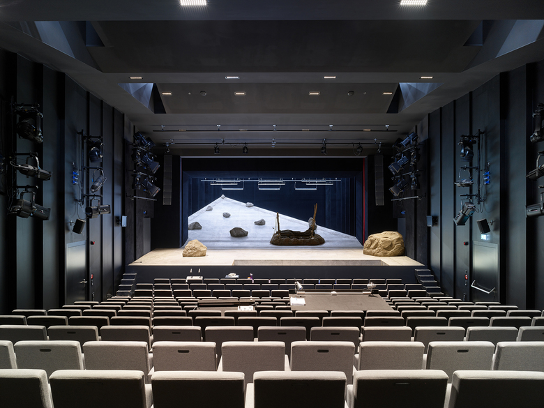 Contextually immersed, the building’s transparent base and open spaces allow the outdoors to visually flow inside while interior functions pour out to the street to engage audiences beyond those attending performances. The large concert hall, with its great glass façade, becomes a plein air stage and the entry plaza, an auditorium. Transparency is dramatized against the building’s glazed ceramic cladding, which shimmers with iridescent blacks and browns as light conditions change day and night.