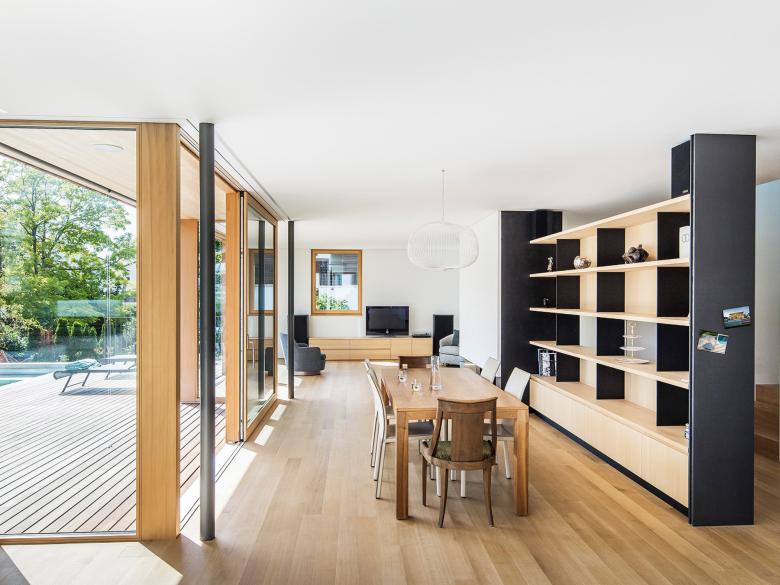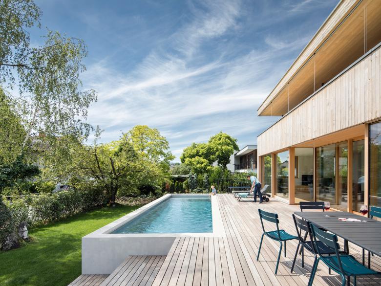 The small window openings in the silver fir façade towards the neighbouring houses only frame specific views. The building opens generously to the south and the garden: room-high sliding doors on the raised ground floor extend the living space to the outside, with direct access to the terrace and an exposed concrete pool. Above, a full-length balcony with a wooden balustrade offers privacy and security to the room-height glazed bedrooms and children’s rooms.