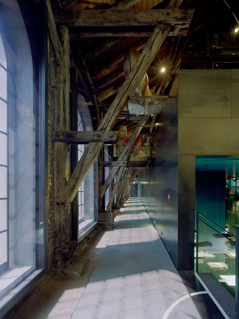 In the former turnery the ticket counter, the café and the museum shop are gathered in a spacious foyer. The round tour on the upper floor begins with a connecting passage at the projection room past the former blast furnaces, which have been preserved as an industrial monument. The two foundries positioned at an angle to each other were completely degutted and extended into the basement. On and below free-standing platforms, a wide array of topics relating to nature and technology are presented.