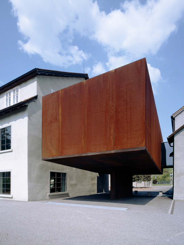 The interior design utilizes the large spaces, while being individually organized on multiple levels. A new connecting structure was breezily stilted on a concrete panel and clad in the same pre-rusted steel plates, as was the biomass heating unit at the front side of the former turnery.