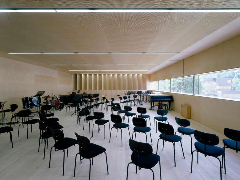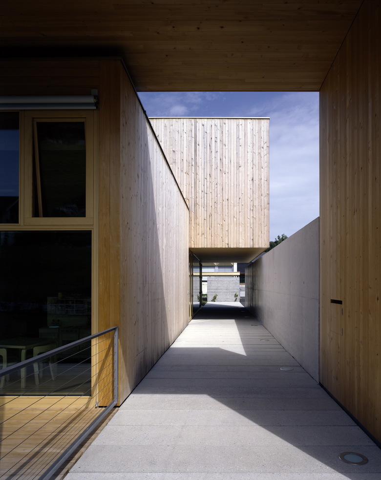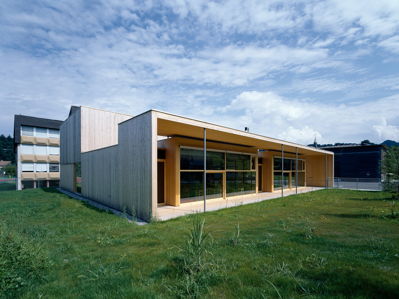 The Kindergarten south of the village center defines the west side of the square. It opens itself to the play garden in the south, while a protecting wall shields the children from the heavy traffic of the parking lot. Two group rooms with dedicated coatrooms are situated along the central corridor of the ground floor. A robust framed construction shades the south-oriented glass façade. Creating a portal, it generously spans the access path and clearly links it to the kindergarten. Situated to the north are adjoining rooms, the office of the head of the kindergarten, a group room and an exercise room. The playrooms are paneled with birch plywood, which creates a warm-colored background for a lively and colorful crowd of children. The upper floor, only about half the size of the ground floor, juts out on the east side over the access path and shields both the entrances. It houses a small lobby and the rehearsal room of the local choir and brass ensemble. The absorption behavior of wall and ceiling elements made of birch plywood has been adapted to specific requirements. The floor has been laid with rough sawn fir wood planks, whose acoustic effect has also been considered. A wide ribbon glazing at the north front lights the room naturally, while preventing heating-up caused by solar radiation.