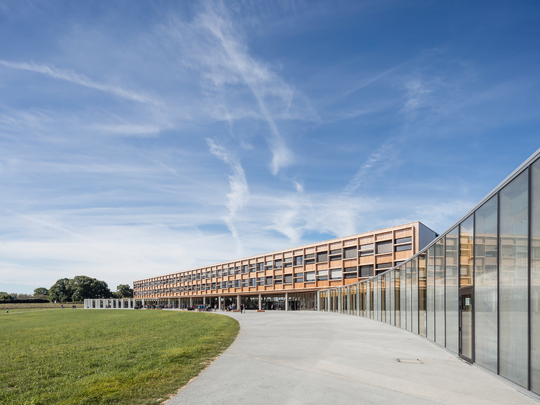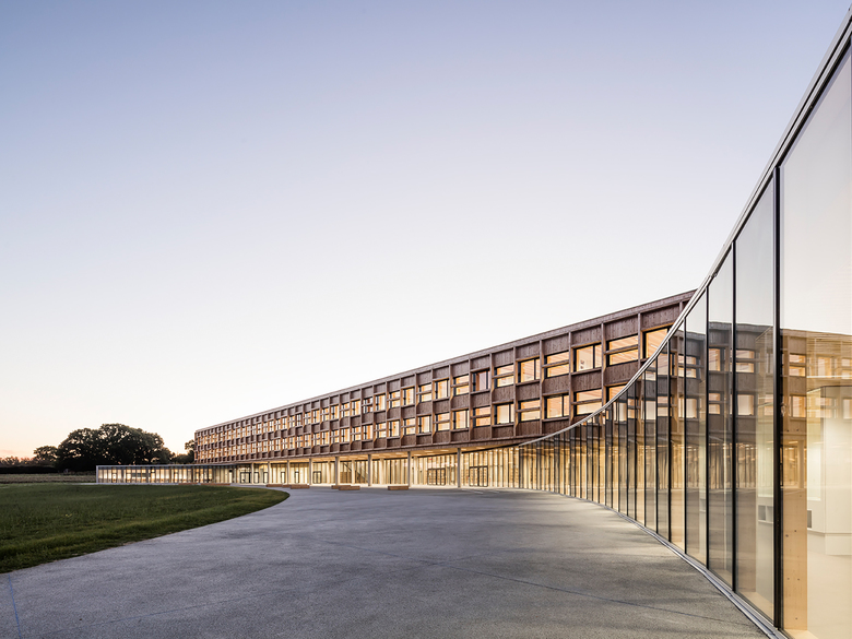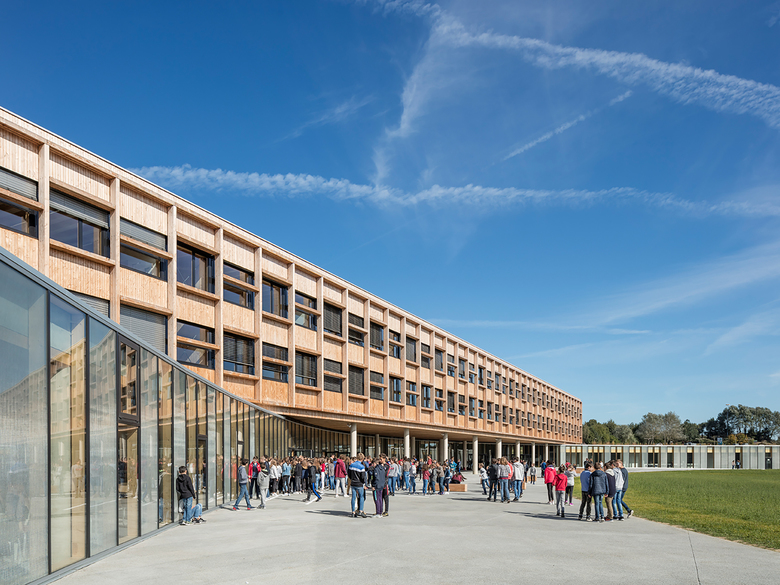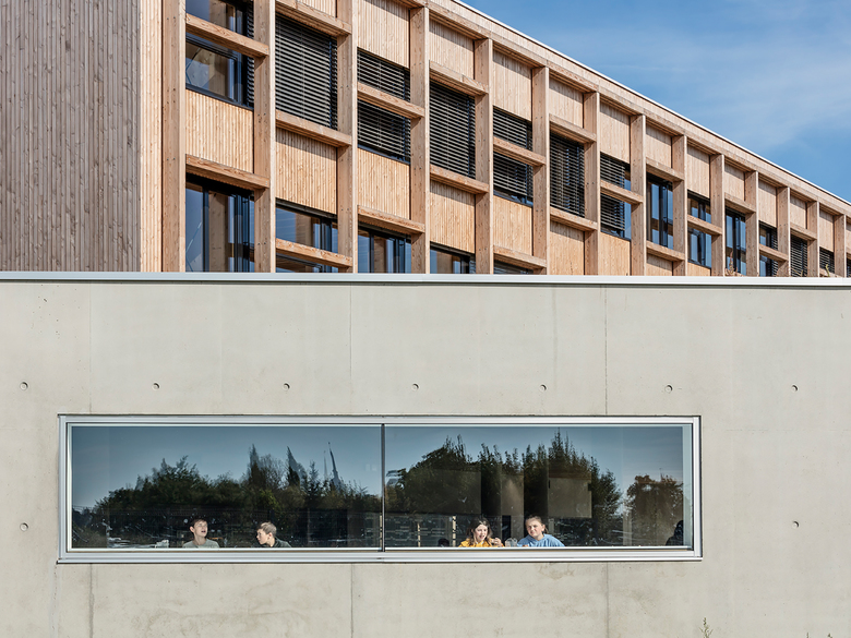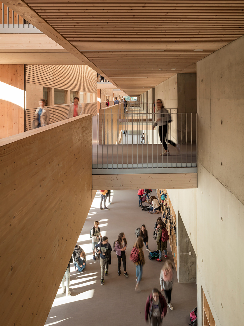 Timber is omnipresent in the design and construction of the building, blending concrete on the ground floor with prefabricated wooden elements on the upper floors. On the southeast and north-west, vertical and horizontal wooden sunshades structure the façade and control the amount of light entering the classrooms. The use of timber also adds to the excellent acoustic performance of the building. The project adopts an environmentally-friendly approach. Untreated local materials help to fit it in with its surroundings and to ensure the durability of the construction.