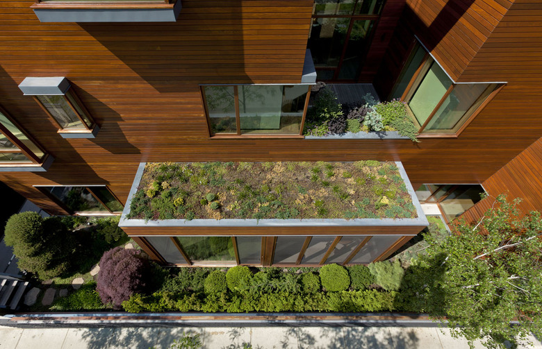 The home utilizes sustainable and environmentally friendly materials and technologies such as green roof systems, automated shade controls, geothermal heating and cooling, a highly insulated building envelope, and low VOC-emission substrates.  Windows are fabricated with insulated, low-e coated glazing, with an additional UV film installed on its interior pane.  In addition, the outer pane of glass consists of two laminated glass layers, adding to the insulating quality of the glazing while minimizing exterior sound absorption. The shifting volumes and primary southern exposure maximize daylighting throughout the home, minimizing the family’s dependence on artificial lighting.  The building’s products and materials inform a responsible and enduring design.