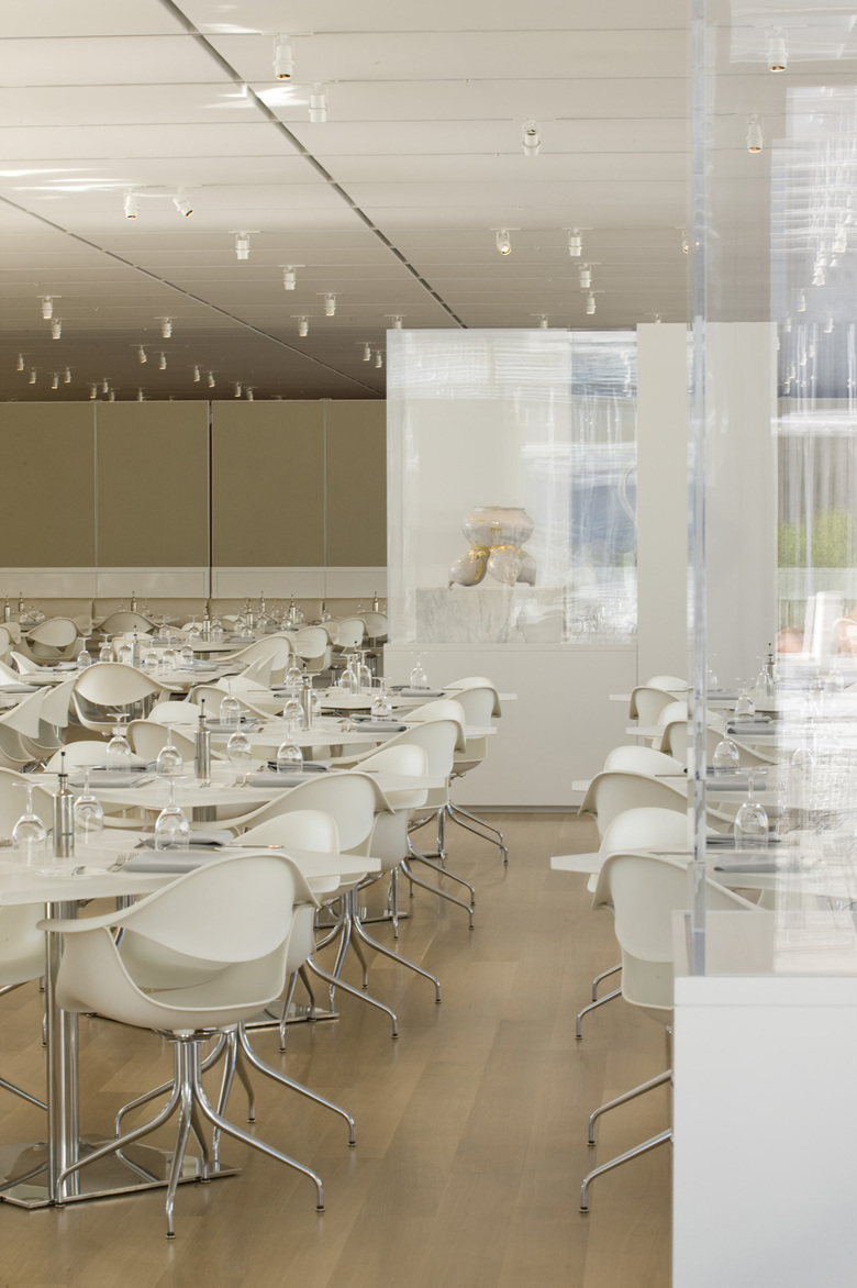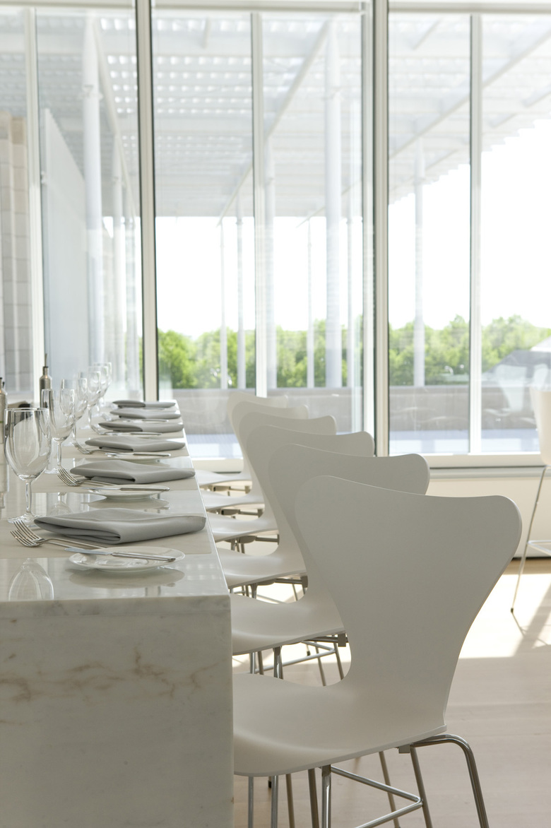 We established that the design of the restaurant would continue the experience of the museum into the dining area. To achieve this we added a series of fixed elements, organized as nodes of activity, which stand free from the walls and ceiling of the 8500sf space. Display vitrines house rotating pieces from the Museum’s collection and bring character to the various dining areas, providing loose edges of boundary. The lunch-only schedule of the restaurant and large areas of window also drove the undeniable presence of natural light in the space. The choice of a predominantly white palette, including resin tabletops which glow when shot with light, was a direct effort to capture the radiance and shadows of the changing presence of sunlight over the course of each day.