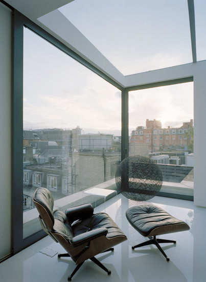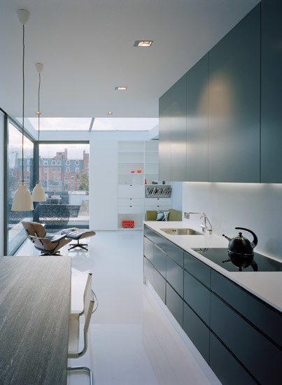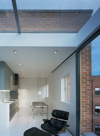 Our proposal was, to extend by building over an existing terrace. Two large sliding doors open into cavities within the walls so that on a good day one can still enjoy the open air.