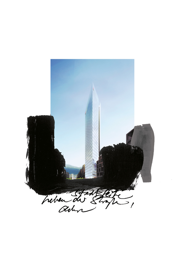 The projects for the Banka Splitska and three additional high-rises were developed subsequent to the competition entry for Novelia Split, a new city district in an area of extreme urban sprawl. The four high-rises—all situated around a traffic circle and all with low building components— constitute the conclusion of a major west-east axis. As easy as it may be to call this spatial and architectural layout of axis and traffic circle “La Défense of Split,” it is quite clear that this area is not just a block of office buildings in the making. The aim is diversity and density. The complex consists of a tower, a low building, and a courtyard. The tower has thirty stories and rises above a parallelogram- shaped ground plan whose broad sides point almost exactly north and south. The low building has five stories with the top story slightly recessed. The tower and low building enclose a rather large courtyard that can be entered through two narrow passes, either from the axis in the west or from the traffic circle in the east. The tower, the low building, and the courtyard between the two—all have to come to terms with the sloping ground level. There is a north-south incline of approximately four meters—a difference of an entire story—over a short distance. The tower and courtyard are on the same level. The low building compensates for the difference by offering a series of open, airy stories on its north, west, and east sides facing the courtyard. The floor areas and staircases of these empty, free spaces lead first from the outside inwards and then upwards to the rear of the restaurant and a few shops, whose main entrance is on the south side of the low building. Given that the lobby of the tower, with its abundance of free space, occupies the ground floor and first floor, and that this first floor is at the same level as the ground floor of the low building, all of the other stories of the building complex appear to be at the same level. In the tower and low building all the columns are on the outer edge of the building, and so the floor plan for the offices allows for virtually any layout solution. What also contributes to this flexibility is that the core of the tower, which serves the purpose of access by virtue of its position, avoids the disadvantages of the purely internal or the purely external situation. The glass façade of the roughly 112-meter tall tower has a double skin—the outer one completely transparent, the inner one partially opaque. The space between the two is equipped with a solar protection system. Geothermal and solar energy sources are also to be used to supply the building, and there is a plan to separate drinking and service water. The underground garage will provide parking places for 370 vehicles.