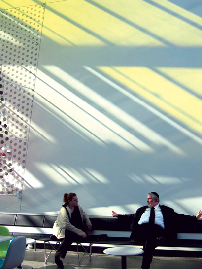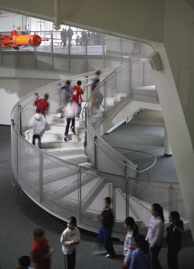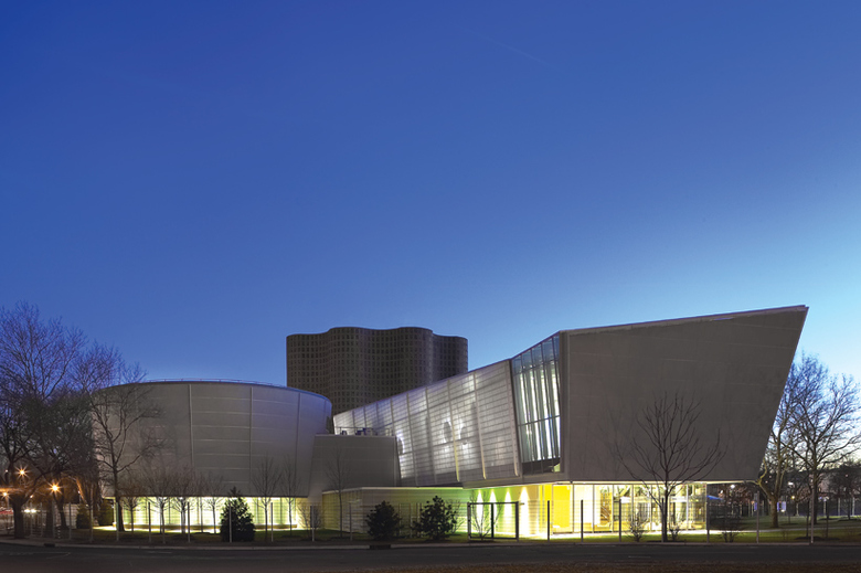 The expansion redefines and augments the exhibit sequence and rationalizes circulation throughout the building. The long, low volume of the new building, defined by luminous folded planes, is a formal counterpoint to the undulating vertical form of the original World’s Fair pavilion, defined by its iconic cellular concrete and dark cobalt cast glass frame. A space of muted white light, the exhibit hall hovers over a transparent base that furthers the museum’s goal of accessibility by allowing passersby glimpses into the interior. The Discovery Labs, adjacent and open to the new exhibition spaces on the upper and lower levels, are given visible identity and ambiguous thresholds to draw in visitors. Also connected to the new hall, an exhibition space for traveling shows provides a light-controlled gallery. A landscaped precinct is home to the renovated Rocket Park and accommodates outdoor programming. Current work includes exterior stabilization of the Great Hall and interior renovations.