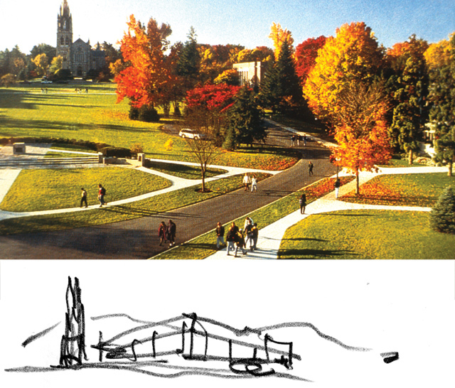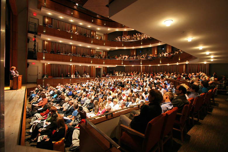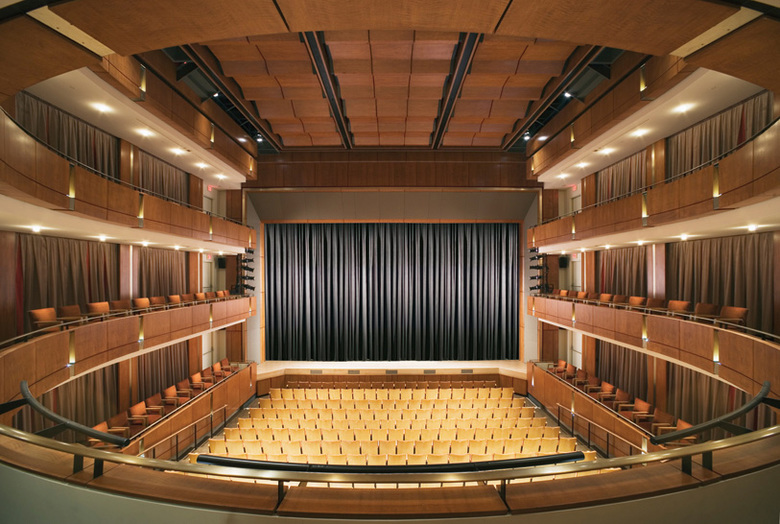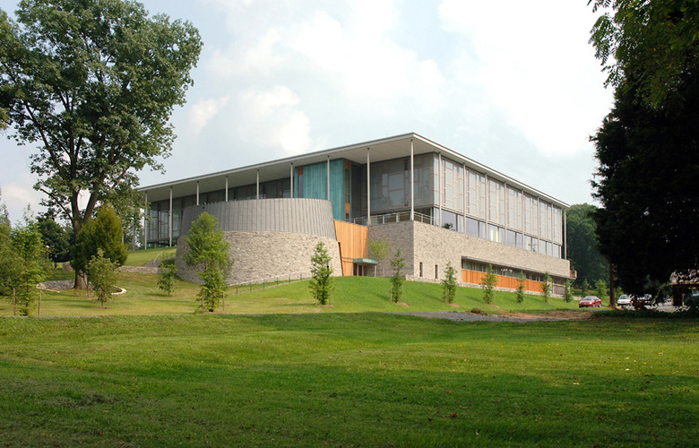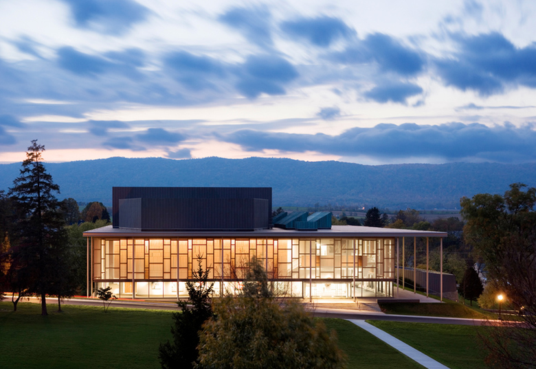 This flexible and sophisticated facility for teaching the performing and visual arts encourages cross-disciplinary exploration. The building mass nestles into its sloped site on the main quadrangle, reinforcing the scale of the campus and diminishing the impact of the theater’s fly tower. Natural materials, including wood and Pennsylvania limestone, reinforce the connection with the sylvan landscape on four sides. The floor-to-ceiling glass curtain wall envelope blurs the distinction between indoor and outdoor spaces. Transparency of the glass and its luminosity at night reinforce access to the arts. Variable acoustics and advanced theater teaching technologies support the Academy’s goal to incorporate the performing arts into its core curriculum, and the theater provides an assembly space to accommodate the entire school.