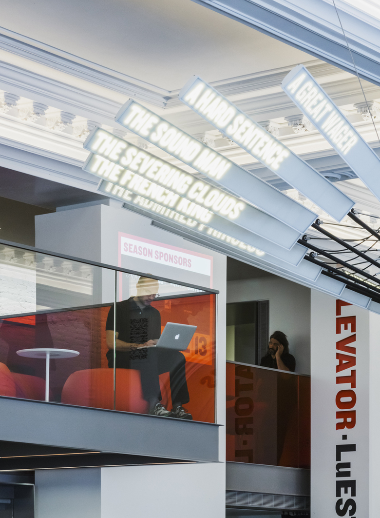 In the lobby interior, plasterwork on the ceilings and walls has been carefully restored and the original archways, which had been walled off in previous renovations, have been reopened. Stairs lead from the expanded lobby to a new public mezzanine and balcony overlooking the main level. This new gathering space rationalizes The Public’s interior, orienting theatergoers by providing a visual connection to the various venues within the building. The new, centrally located box office and new entry to Joe’s Pub further reinforce the vitality of the lobby. Adjacent to the lobby are a coat check and new ADA-accessible restrooms. Food service for both Joe’s Pub and the lobby concessions will be enhanced by an expanded kitchen. Heating, ventilation and fire suppression systems have been upgraded, and the renovated spaces have been outfitted with audio visual systems.