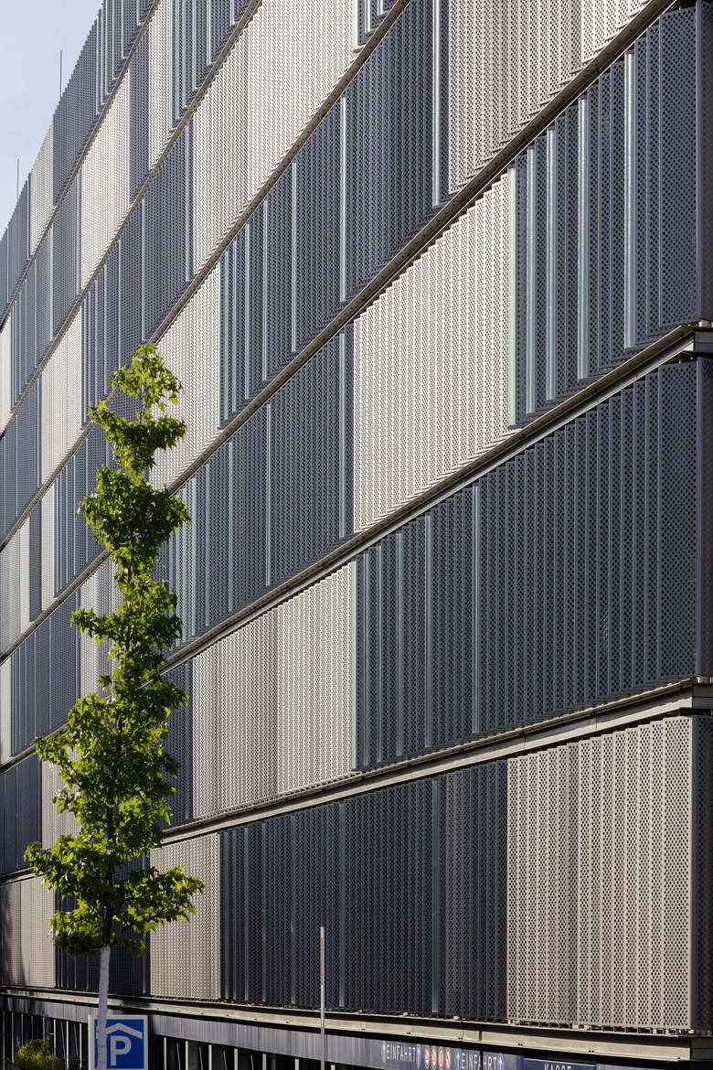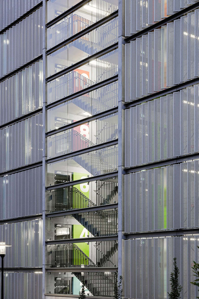 Die Hauptfassade oberhalb der Sockelzone besteht aus einer thermisch offen Blechlamellenverkleidung aus rechteckigen, allseitig mit Lochblechen unterschiedlicher Lochung und Färbung verkleideten und geschlossenen Lamellen. Eingestreut zwischen den Blechlamellen sind Lamellen aus Gussglaselementen.