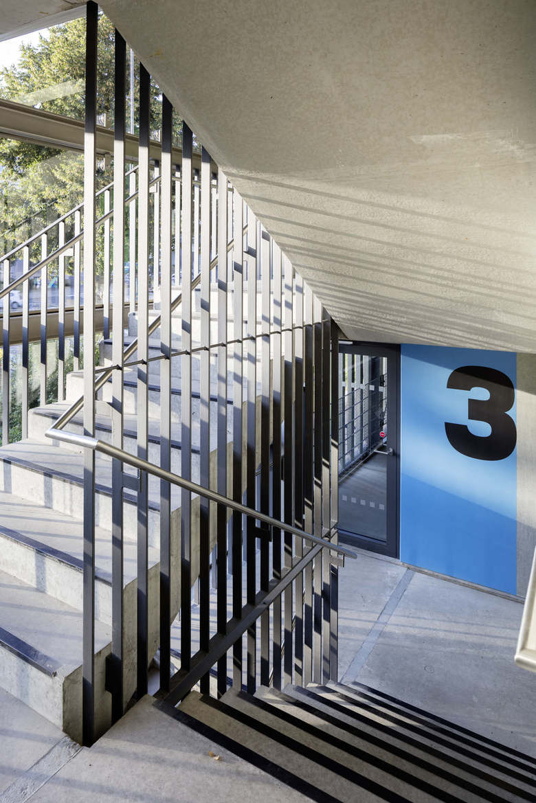 Fassade – Das Gebäude besitzt entsprechend den unterschiedlichen Aufgaben und Funktionen 5 unterschiedliche Fassadenbekleidungen. Das Gebäude erhält zunächst umlaufend eine offen gestaltete Sockelzone. Im Bereich der Giebelflächen besteht diese jedoch aus Fassadenelementen aus WU-Beton in Sichtbetonqualität.