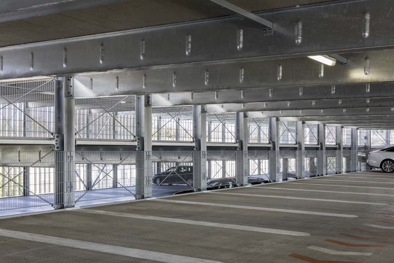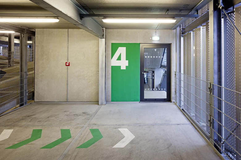 Die Innere Erschließung des Gebäudes erfolgt über Einbahnstraßen. Der Stellplatzsuchverkehr nutzt in der Aufwärtsbewegung dabei stets die äußeren Rampen. In der Abwärtsbewegung nutzt dagegen der Ausfahrtsverkehr die beiden mittleren eng nebeneinander liegenden Rampen.