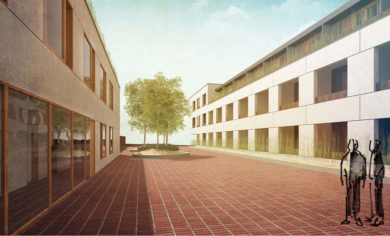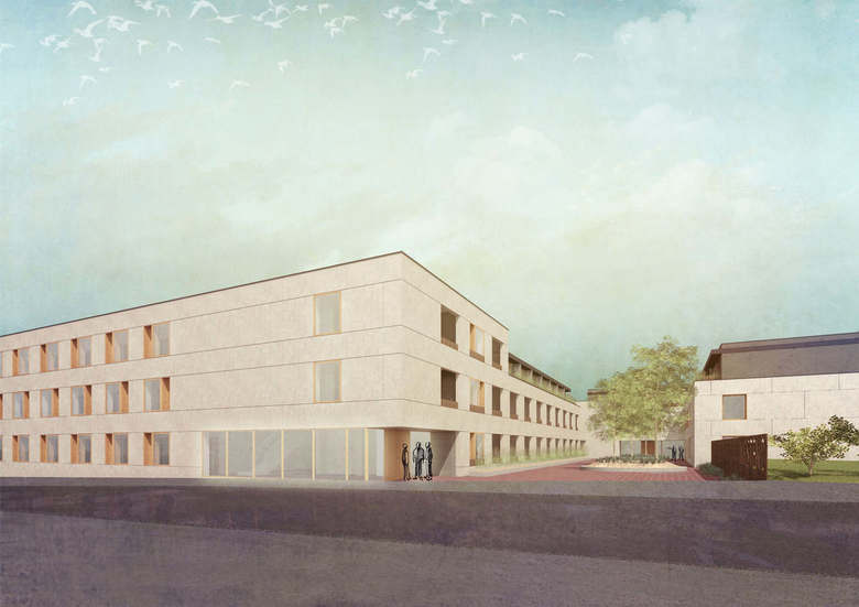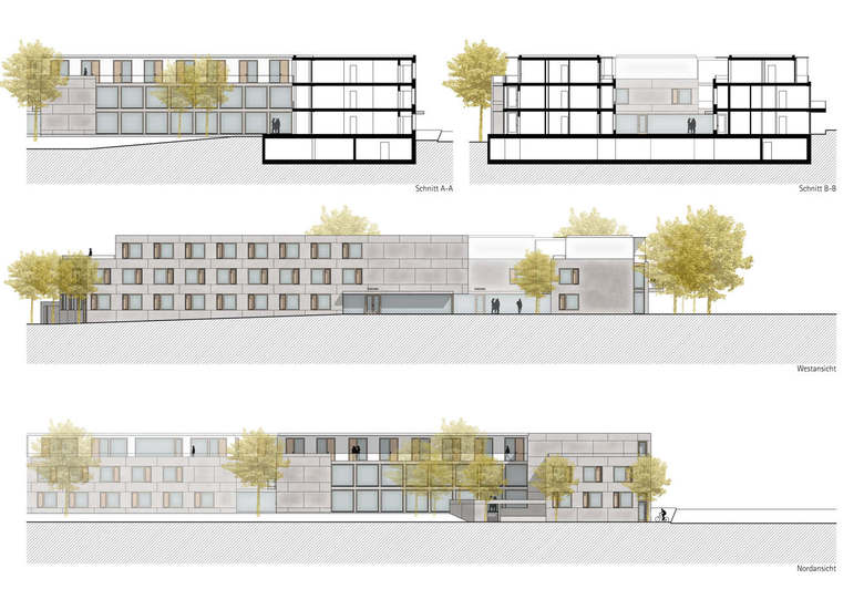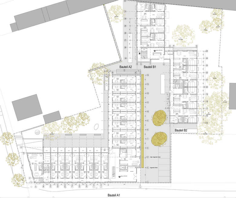 Erschließung – Die Erschließung der Bauteile erfolgt über zwei zentrale, großzügige Eingangsbereiche. Von hier werden die einzelnen Gebäudeflügel über lichte und gestaltete Erschließungsflure, die als Kommunikationszonen fungieren, erschlossen.