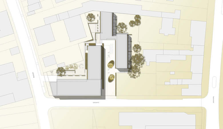 Entwurf – Die vorgeschlagene Bebauung besteht aus zwei Bauteilen. Bauteil A formuliert als straßenbegeleitende Bebauung einen Blockrand zur Lennéstraße. Bauteil B definiert im Blockinnenbereich einen geschützten und intimen Wohnhof. Unterhalb des Gebäudes befindet sich eine Tiefgarage mit ca. 57 Stellplätzen die von der Westraße erschlossen wird.