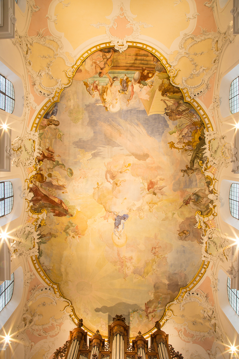 Retouching the countless cracks and cleaning up the colours ensured that the visual camber of the ceiling came into its own once again with full illuminating power.