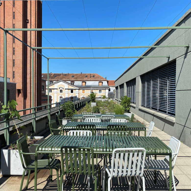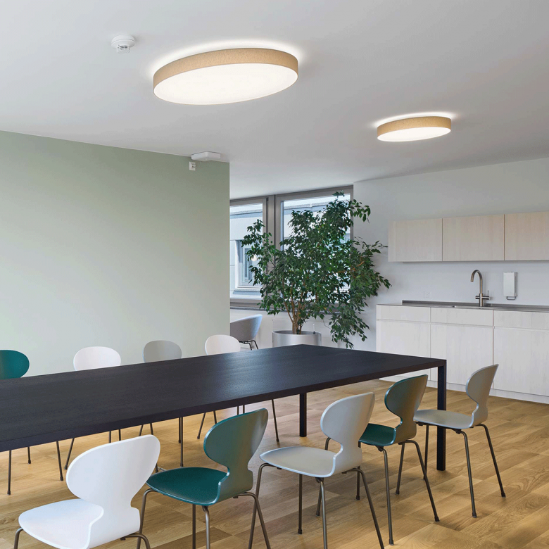 Neben diesem Bereich befindet sich eine Kaffeeküche. Eine zweite Küche befindet sich im Kern des Mitarbeiterbereichs und ist durch ein sehr grosses Oberlicht beleuchtet.