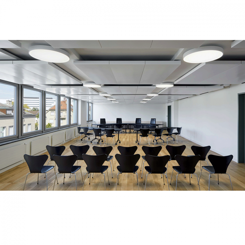 Baswaphone-Decken in den Büros und Deckensegel im Verhandlungssaal sorgen für eine angenehme Akustik. In den Büroetagen wurde durchgängig Parkettboden verlegt.