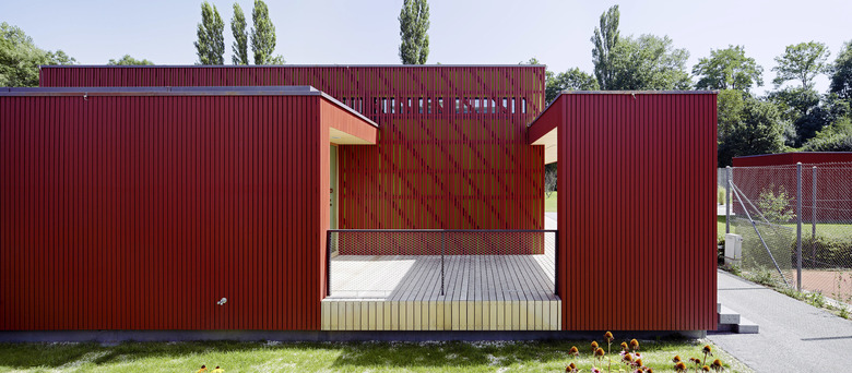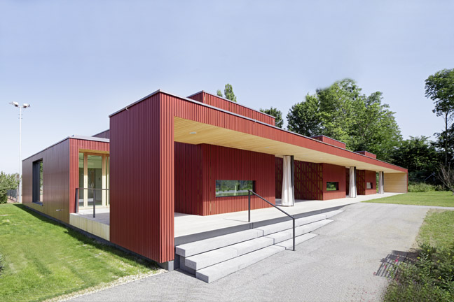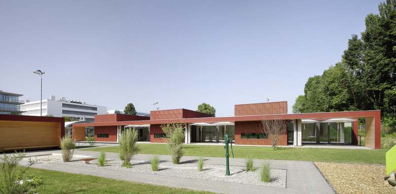 Variance procedure 2010, 1st place: The new nursery for three groups was created nestled between the tennis court and the protected shore zone. The wooden structure that is based on the design of a single-storey club house was erected within two weeks from prefabricated elements.