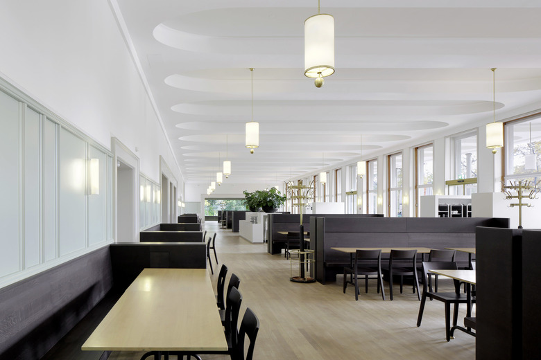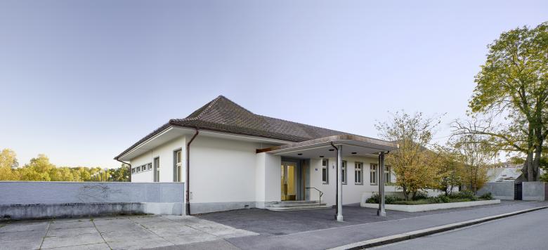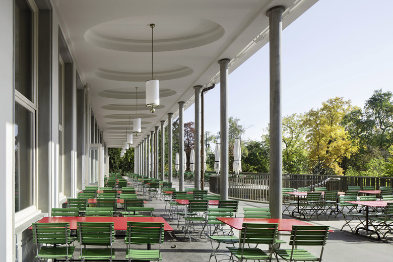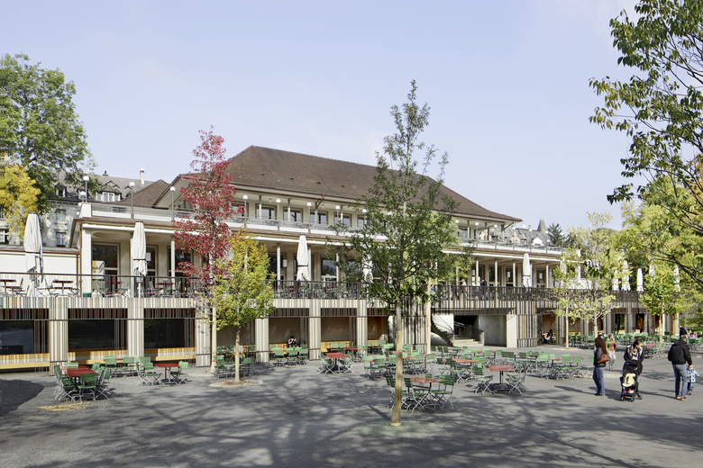 Project competition 2011, 1st place: The restaurant building, listed among the buildings worthy of protection by City of Basel, was erected by architect Heinrich Flügel in 1935, as a complete concept with hospitality area, entertainment in the form of a theatre, cinema and bowling alley, and music pavilion. The design is guided by the architectural preservation of expression of the building and his special qualities. The existing structure of the area accessible to visitors remains, though the interior has been given a gentle facelift. Large, side panoramic windows create a more open, lighter atmosphere within the self-service restaurant. A reinterpretation of the base, as a new spatial stratum in front of the main building evokes the required separation between the picnic zone and the restaurant terrace.