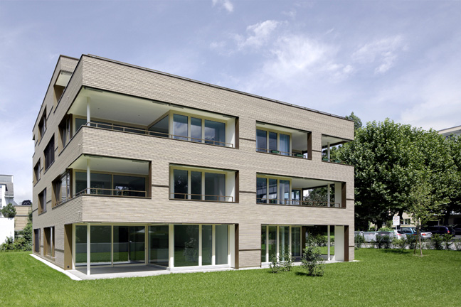 The apartment building is a building to replace a 1950s apartment block and is located in Dornach within walking distance of the railway station. The building gives way to a wide, south-facing garden beneath which the parking garage is located. Two apartments per storey are symmetrically mirrored against a central wall; the bathrooms and kitchens are encapsulated as the core in the centre. Living and sleeping areas are separated from one another. The house opens up towards the south with a continuous balcony. Cooking, eating and living are divided up by the intersected balcony. The rooftop apartments have a large roof terrace on the south side.