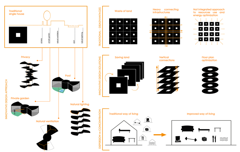 DNA Tower combines the advantages of a traditional single house (privacy, exclusive outdoor spaces, natural light and ventilation) with different aspects: first a conscious use of land, thanks to vertical connections instead of traditional heavy connecting infrastructures, floor plan optimization and services aggregations; second the use of advanced technologies such as automatic thermal changing panels for external finishing, highly insulated glass windows for thermal comfort and reduced energy consumption, solar-heated brise-soleil system to produce renewable energy; third a conscious use of natural resources such as rainwater collection used for watering plants and recycled drain water from basin and shower.