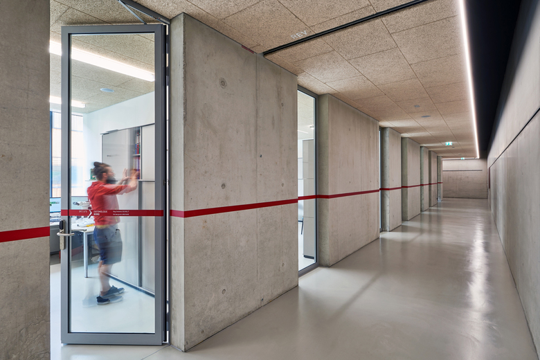 Die mit grauen, glasfaserverstärkten Betonplatten (FibreC) verkleidete Fassade mit seinen unregelmäßigen faustkeilförmigen Ausbuchtungen gibt sich hermetisch, wehrhaft wie eine Rüstung. Wenige reduzierte Perforierungen durchbrechen die panzerartige Haut: das Tor für die LKW Schleuse, Lüftungsschlitze, die gesetzlich vorgeschriebenen Fenster zur Tischlerei und der Haupteingang. Rot leuchten die Innenseiten des Tores, dann wenn es an den Arbeitstagen geöffnet ist.