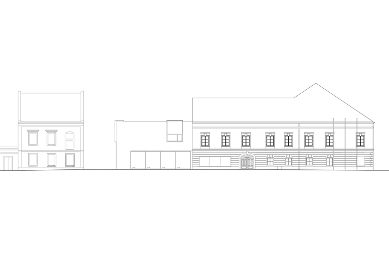 Verschmelzung von Innen und Außen – Der Saal, der im Altbau und dann nach dem Wettbewerb auch am Marktplatz keinen Platz fand, wurde in einem neuen Erweiterungsbau untergebracht, der bei geöffneter Fassade Innen und Außen, wie man es von historischen südeuropäischen Bautypen kennt, verschmelzen lässt: Er wird zum gedeckten öffentlichen Raum zur Linzerstraße vorne und zum Arkadenhof hinten.