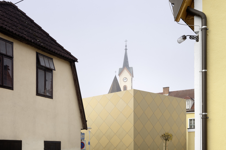 Markantes Zeichen am Platz – Die Gemeinde wagte mit uns eine selbstbewusstere Geste. Wir stellten einen acht Meter hohen, hermetisch geschlossenen Stahlbetonkubus auf den Platz davor. Keine Perforierungen, keine Auskragungen. Über eine Rampe und eine verdeckte Türe gelangen die KünstlerInnen ins Innere. Ein goldener Würfel für die Musik. Durch das Fensterband des unteren Geschosses, das in die Erde versenkt wurde, schwebt der Klangkörper über dem Platz.