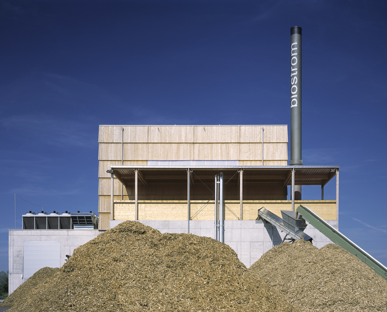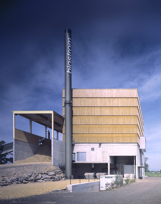 Im vorderen Gebäudeteil – der Stromerzeugung – befindet sich neben dem Steuerungsraum ein Traforaum. Dahinter ist das Heizwerk mit Beschickung, Heizofen und Rauchgasreinigung angeordnet. Über dem 7,5m hohen Betonsockel erhebt sich eine Holzkonstruktion aus Fichten- und Tannenholz, welche fassadentechnisch mittels überdimensionalen Holzschindeln beplankt ist.