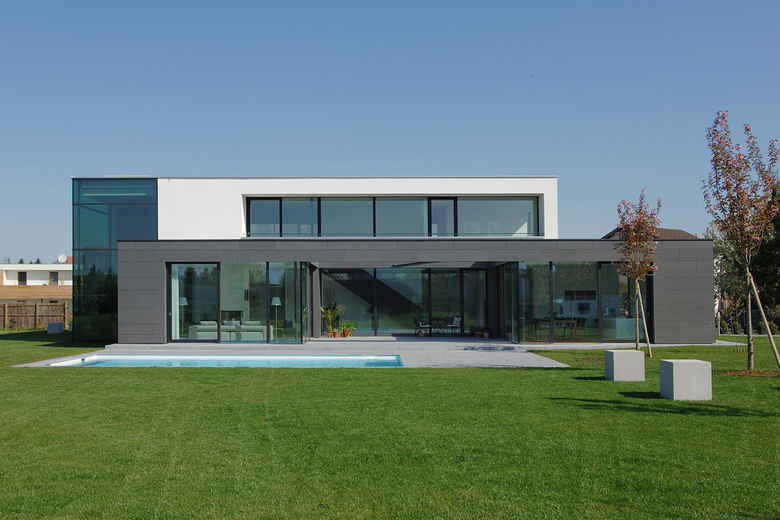 Die geometrische und architektonische Grundidee besteht in der Verschneidung zweier Kuben. Der eine eingeschossig und horizontal orientiert, der andere zweigeschossig und vertikal aufgestellt. Die Verschneidung wird durch die Materialwahl hervorgehoben. Der horizontale Kubus ist mit Eternit verkleidet und ruht, durch eine Schattenfuge getrennt, auf dem Boden. Der weiss verputzte vertikale Körper steht im Kontrast dazu. Durch Einschnitte in die Körper entsteht eine überdeckte Eingangssituation, eine Terrasse und ein Balkon. Großflächige Verglasungen des Wohnzimmers, der Küche und vor allem des Palmenhauses lösen die Kuben in ihrer strengen geometrischen Form weiter auf.