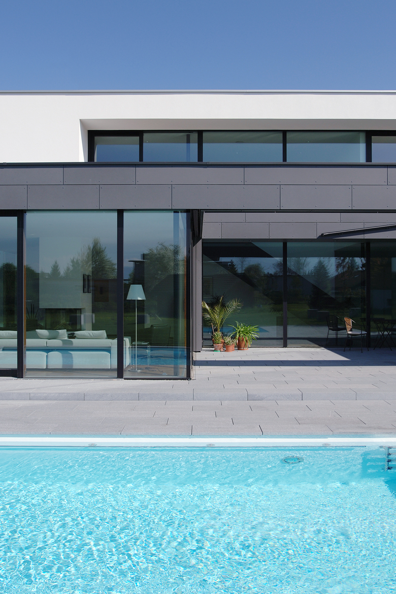 Die Verglasung nach Süden ermöglicht einen weiten Blick in den Garten und den Austritt auf den Innenhof ähnlichen Bereich der Terrasse, welcher sich zwischen Küche und Wohnzimmer schiebt. Den Bodenbelag der Terrasse bilden Granitplatten. Von hier gelangt man über eine Stufe auf die Gartenebene der Terrasse, in welche der 43qm große Pool ebenerdig eingelassen ist. Er ist weiß beschichtet und besitzt eine integrierte Abdeckung, die den Pool vor Verunreinigung schützt.