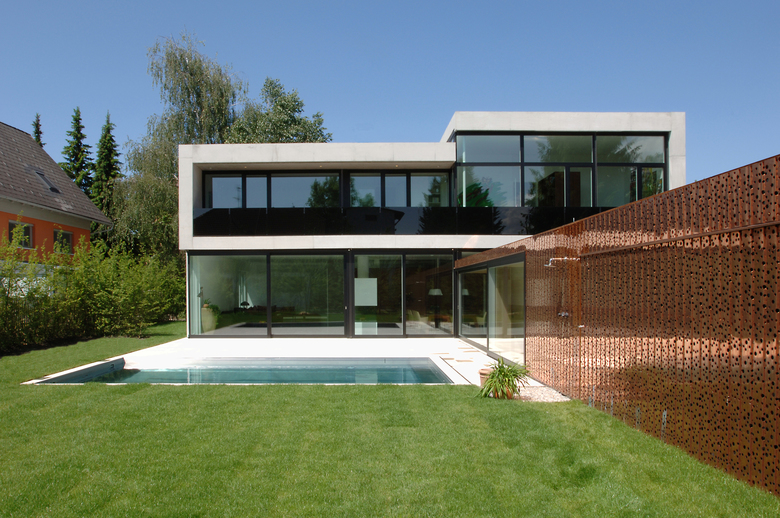 Der Betonbau, von außen wehrhaft und hart empfängt seine Besucher hinter der Eingangstür warm und herzlich. Durch den vorgelagerten Kupferquader, die eigentliche Tiefgarageneinfahrt, wird der private Außenbereich vom halböffentlichen Bereich getrennt und bietet gleichzeitig Sichtschutz.