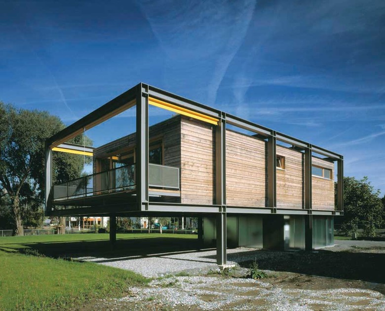 Eine abgehobene Kiste ist diese Singlehaus in der österreichischen Gemeinde Hard, das über dem großzügigen, stark durchgrünten Grundstück zu schweben scheint. Eine leichte Stahlkonstruktion bildet den äußeren Rahmen des ungewöhnlichen Gebäudes und gibt ihm die nötige Bodenhaftung.
