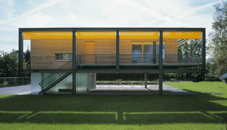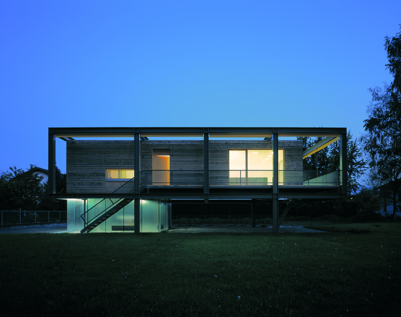 Das Wohngeschoss ist als Holzbox in die obere Eben geschoben. Darunter liegen, in einem deutliche kleineren Kubus, Garage und Nebenräume. Bereits von außen wird die Trennung in zwei unterschiedliche Funktionsbereiche durch die Wahl der Materialien deutlich gemacht. Die Fassade des Moduls, eine Holzrahmenkonstruktion aus vorgefertigten, wärmegedämmten Wandelementen, ist mit waagrechten leisten aus Weisstanne verschalt. Die Garagenbox erhielt hingegen eine transparente Haut aus satiniertem Glas.