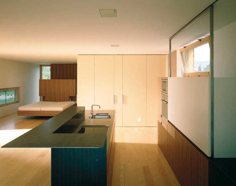 Sämtliche Einbauten bis hin zur Schlafstätte aus Ulmenholz und der Küchenzeile mit ihrem ungewöhnlichen Bartresen aus rohem Walzstahl sind und signalisieren ungekünstelte Bodenständigkeit. Allein in der Wohnzone dominiert warmes Eschenparkett. Die übrige Möblierung ist auf ein Minimum reduziert, so dass das maßgeschneiderte Einraumhaus um so großzügiger scheint. Ein schwenkbarer Fernseher erlaubt zudem räumliche Rezeptionsfreiheit.