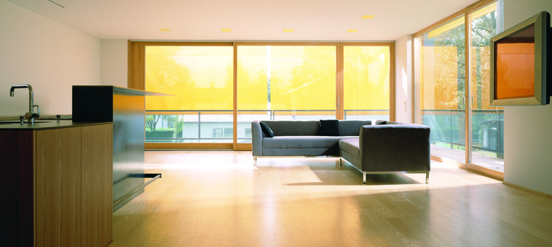 Nach Süden hin lässt sich der Wohnbereich über raumhohe Schiebetüren nach außen auf die vorgelagerte Terrasse erweitern. Die hier und nach Westen hin situierte Übereckverglasung sorgt dafür, dass das Gebäudeinnere hochgradig besonnt und belüftet werden kann. Als Schattenspender an heißen Tagen dienen maisgelbe Bahnen aus Segeltuch, die zwischen die Stahlrahmen eingespannt sind und das Haus auf originelle Weise mit einer zweiten, farbenfrohen Außenhaut umhüllen.
