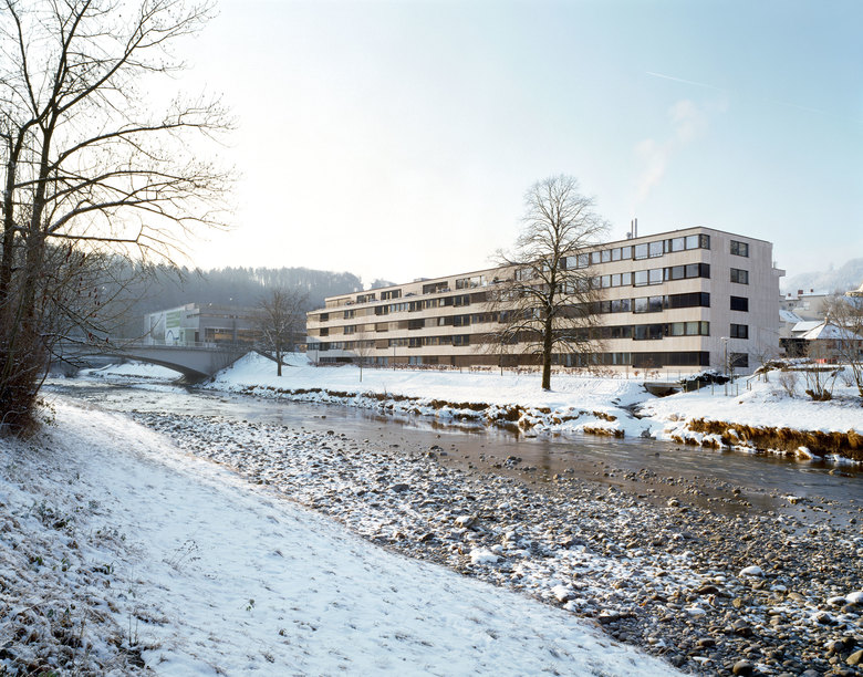 A total of fifty-seven apartments ranging from 2- to 5.5-room layouts over one or two stories show typologies matched to their respective position: along the river Sihl, there are single-story apartments with deep floor plans and spacious river-facing living room/kitchen combinations that extend diagonally into the living spaces facing the courtyard. The Leimbachstrasse side accommodates maisonette apartments with rooms looking out towards the courtyard. They can be accessed from the street via glazed balcony walkways that effectively mitigate the noise.