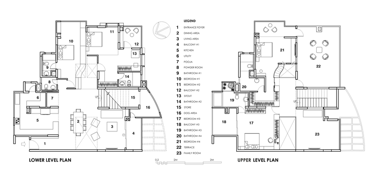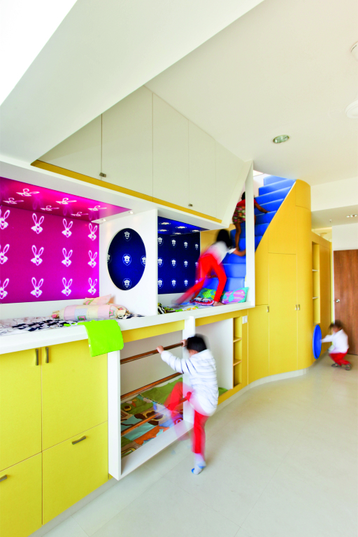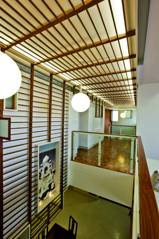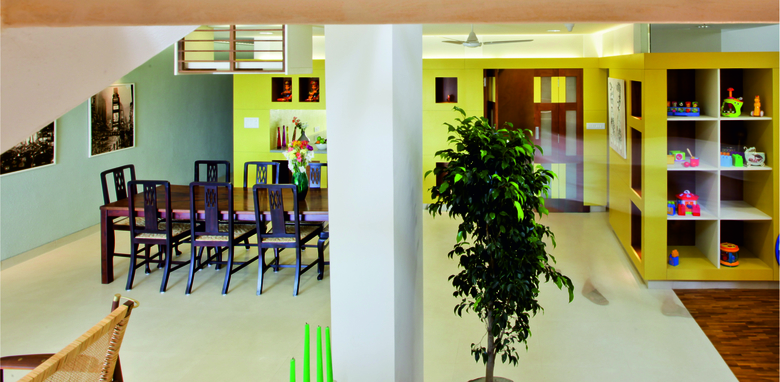 The main idea was the living, breathing and functioning of this family. The brother and their wives were given the upper level for its privacy and the parents and children were on the lower level with the dining, living and other areas. The children’s bedroom also served as a guest room. So they are tucked into individual bunk niches, which become their spaces in the house. From here, they access the upper level and the play area, all under their grandparent’s watchful eye.
