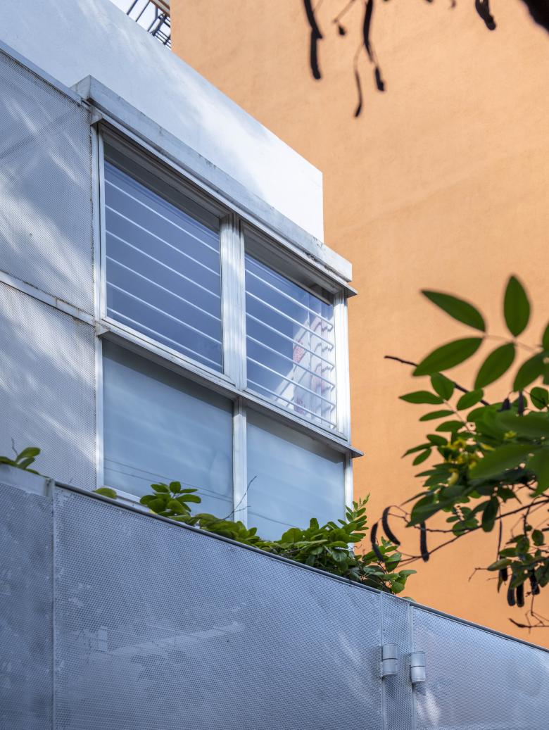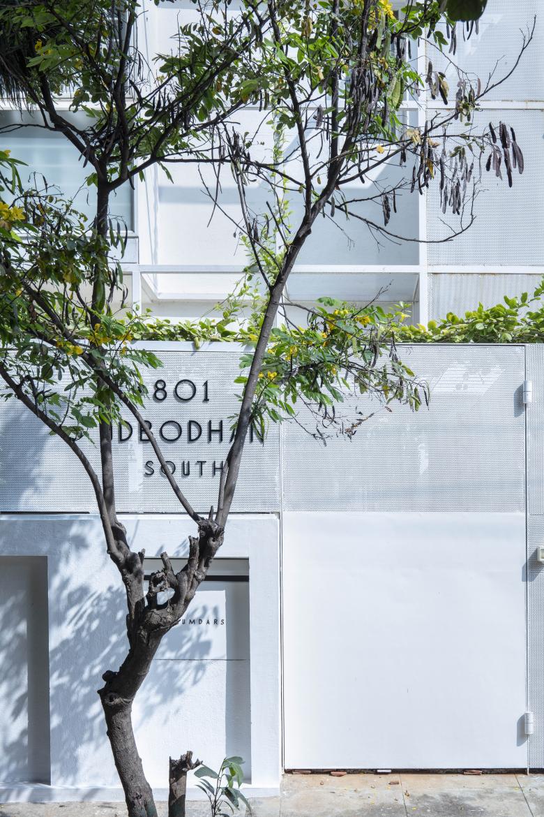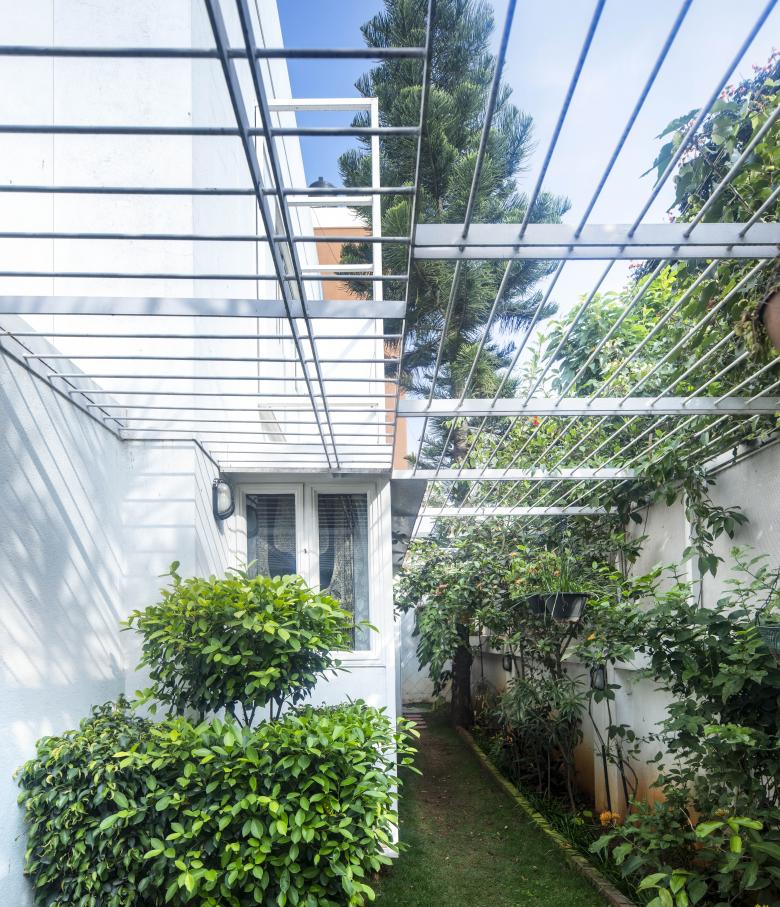 The steel scaffold showed up externally as well, to extend the living spaces into beautifully activated gardens in the west and the south road facing facades. The compound walls were raised and grilled above, to include these gardens into the privacy and security of each house.