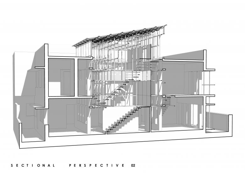 A square of 20'x20' in the centre of the building was broken down carefully becomingthe central core for this intervention. This space became the volume catalyzing the restructuring process.