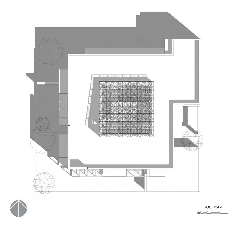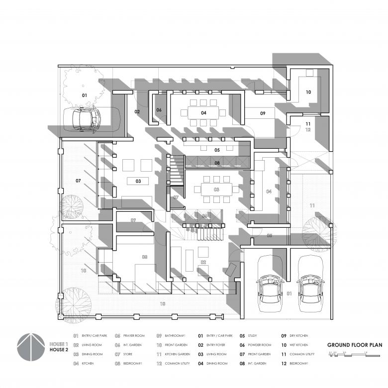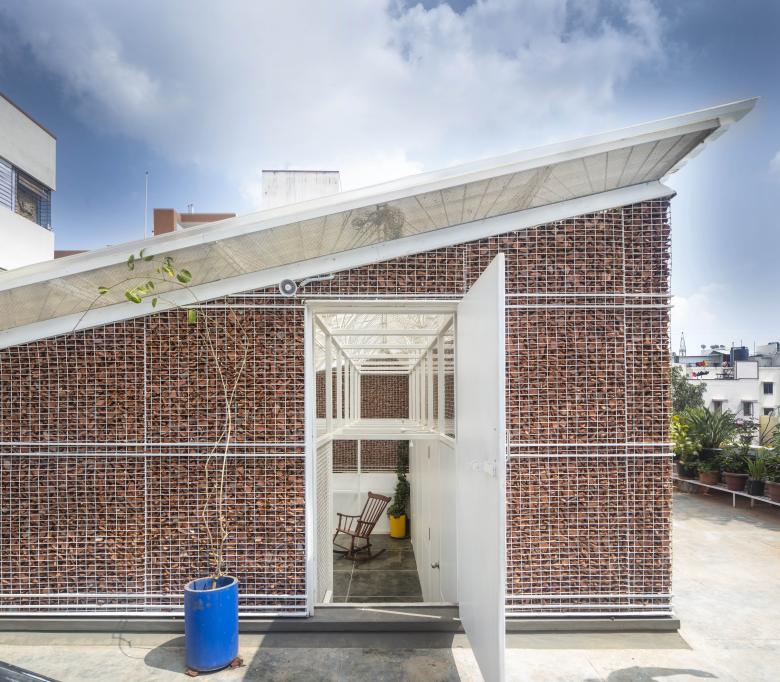 A light translucent sheet above the central core gets bright sunlight into both the houses, as it also enables cross ventilation for the peripheral spaces.