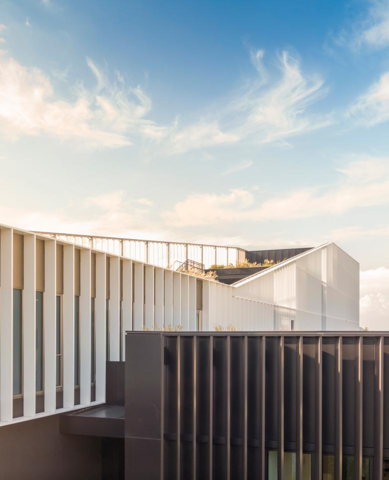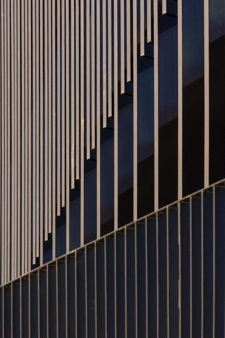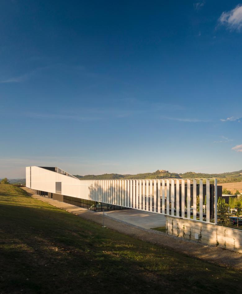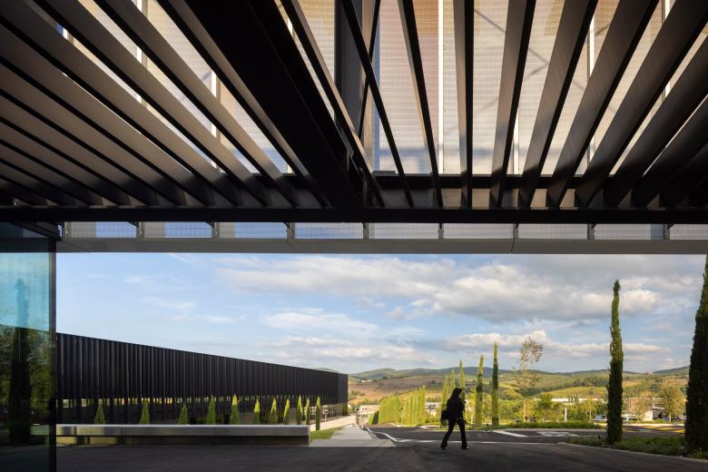 The main entrance recalls the archetype of the Tuscan villa access: a linear row of cypresses to welcome the visitor and show the way through. This rhythm is replicated on the facade of the buildings with sunscreen filtering blades that control the amount of light that can get through the work spaces in relation to the orientation and the seasons.