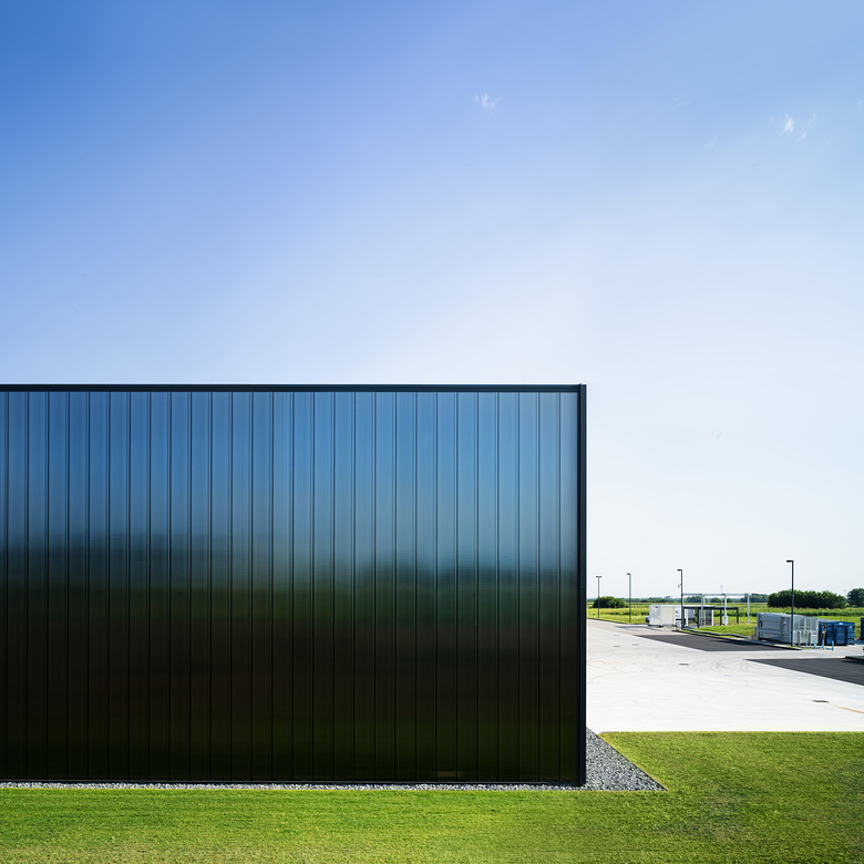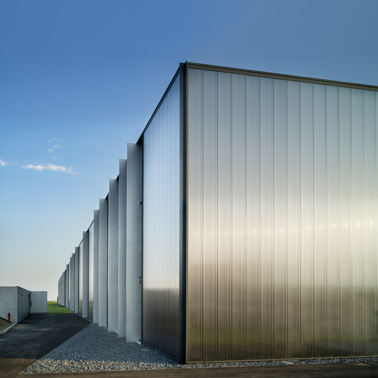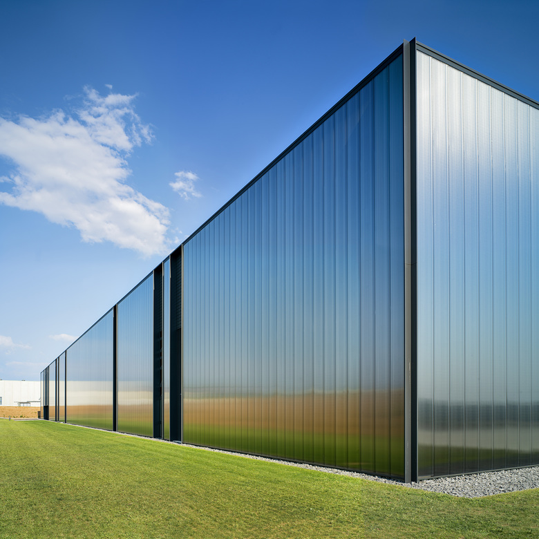 The facade consists of a single material, in a unique size: a 4 centimeters thick polycarbonate panel, about 10 meters high, fixed to prefabricated concrete panels. The polycarbonate panels are customized for this project, in order to obtain a reflecting facade when seen from afar and "deep" when observed closely. The panels consist of two different types of polycarbonate combined together: the rear side has an opaque compound which impedes the light to pass through, while the front is frozen. In this way the load-bearing structure is completely hidden behind the cladding system and the verticality of the new facade sets up an interesting dialogue with the black concrete panels of the existent building. From afar the building reflects the sky and appears cladded by huge glass plates, while close up it looks "lighter", maintaining a dialogue with the pre-existence. The mirroring of the panels also ensures a continuous color variation of the facades: depending on the time of the day and varying in light intensity the building may appear black, golden, metallic, opaque, glossy. Infinitely changeable.