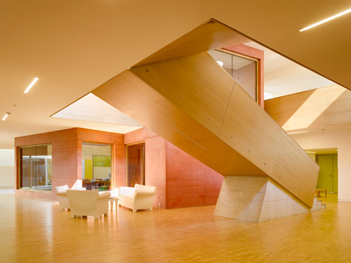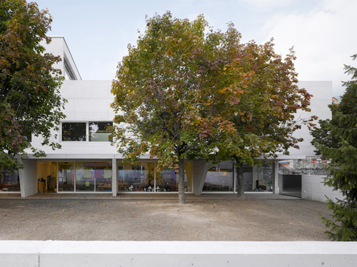 A ceux-ci s’ajoutent des locaux communs, tels que salle de peinture, de cuisine, de théâtre, de motricité et multimédia. Ces éléments s’organisent autour d’un espace central ponctué par trois tours qui contiennent les locaux communs. Elles se développent sur double hauteur et créent ainsi des liens visuels entre les différents groupes qui occupent la nouvelle crèche. C’est le lieu de rencontre, d’échanges, le point de référence du projet.